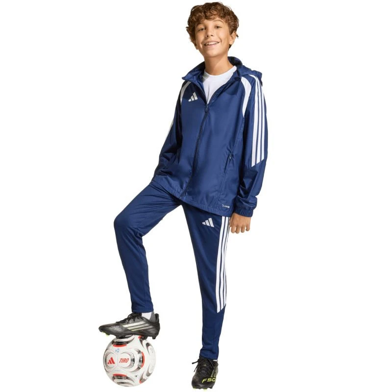 Dětská bunda adidas Tiro 26 League navy blue JY9725 Tato dětská bunda adidas pochází z řady Tiro. Podšívka ze síťoviny. Systém Clima365. Zip po celé délce. Nášivka na ochranu brady. Neodnímatelná kapuce bez možnosti regulace. Dvě boční kapsy na zip. Standardní střih. Manžety s elastickými manžetami. Technické údaje:- Materiál: 100% polyester (recyklovaný)- Standardní střih- Kapsy na zip- Podšívka ze síťoviny- Neodnímatelná kapuce- Elastické manžety.