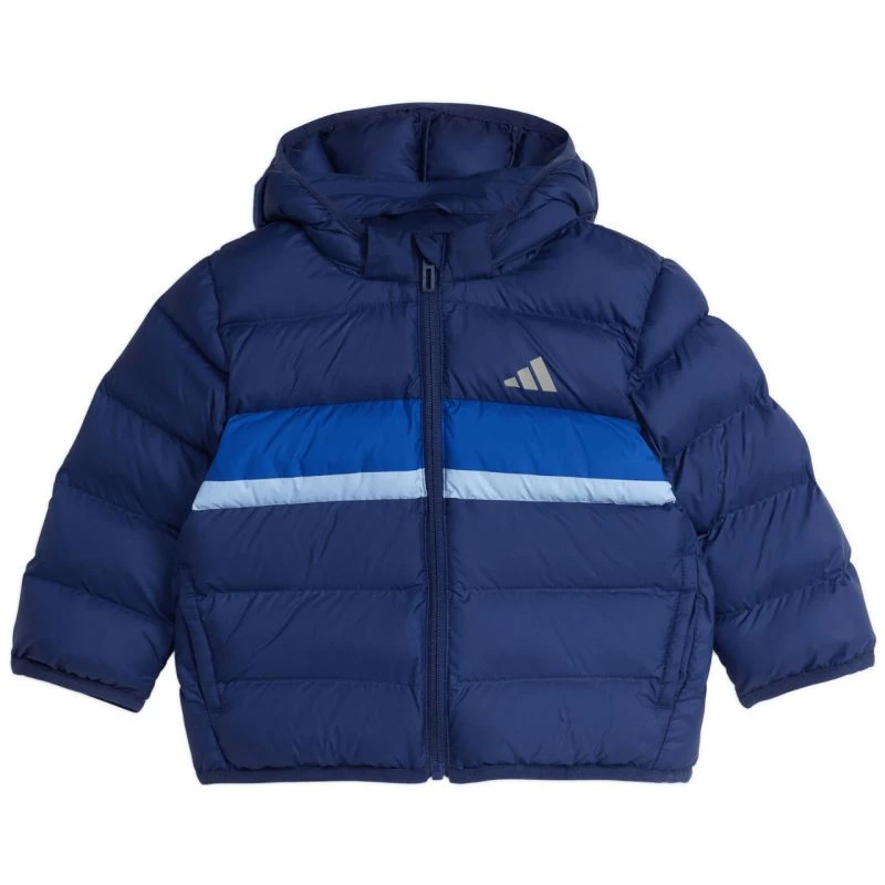 Dětská bunda adidas Synthetic Down Navy blue JL7392 Dětská bunda adidas je ideální pro zimní dny. Standardní střih. Syntetická výplň rozložená na horizontálních panelech v kombinaci s technologií Climawarm zahalí tělo teplem a zároveň nabízí odvod přebytečné vlhkosti. Zip po celé délce. Neodnímatelná nenastavitelná kapuce. Vnitřní jmenovka umožňuje personalizovat bundu pro vaše dítě. Materiál: 100% recyklovaný polyester.