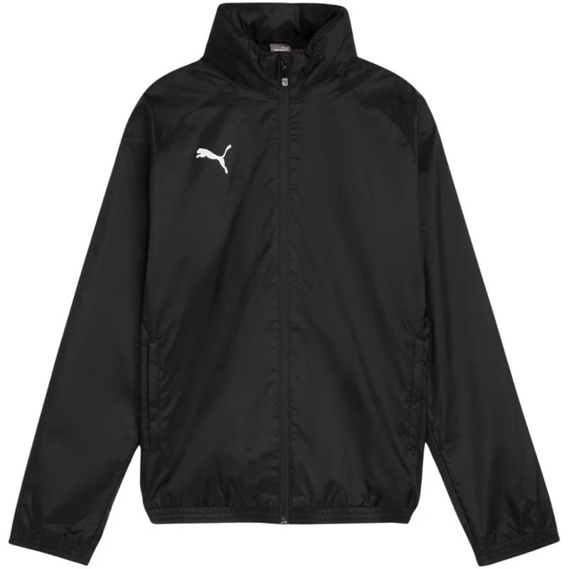 Kurtka dla dzieci Puma Team Goal All Weather czarna 659045 03 Kurtka dla dzieci sprawdzi się podczas treningów i codziennego użytkowania. Konstrukcja wykonana z wodoodpornego i wiatroszczelnego materiału. Dopasowany krój. Długi zamek zakończony patka ochronną. Wysoka stójka. Kaptur chowany w kołnierzu. Ściągacze przy mankietach i u dołu. Dwie, zapinane kieszenie boczne. Wnętrze kurtki podszyte siateczką. Niewielkie logo na piersi. Materiał: 100% poliester z recyklingu