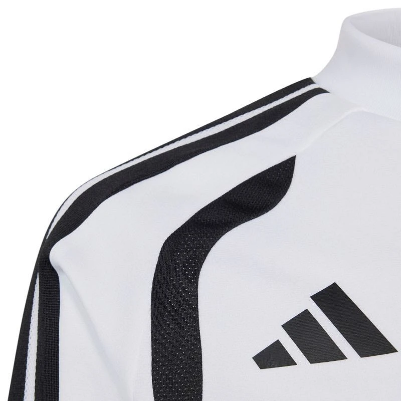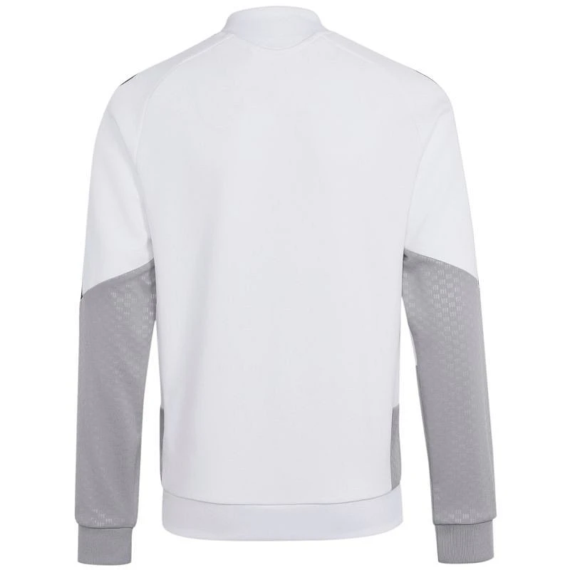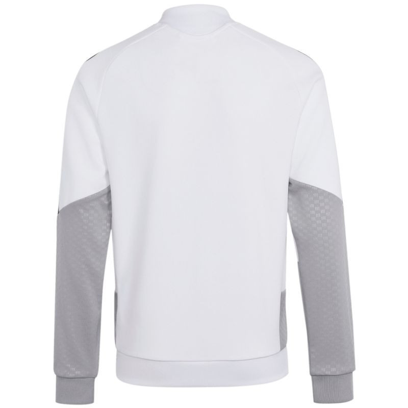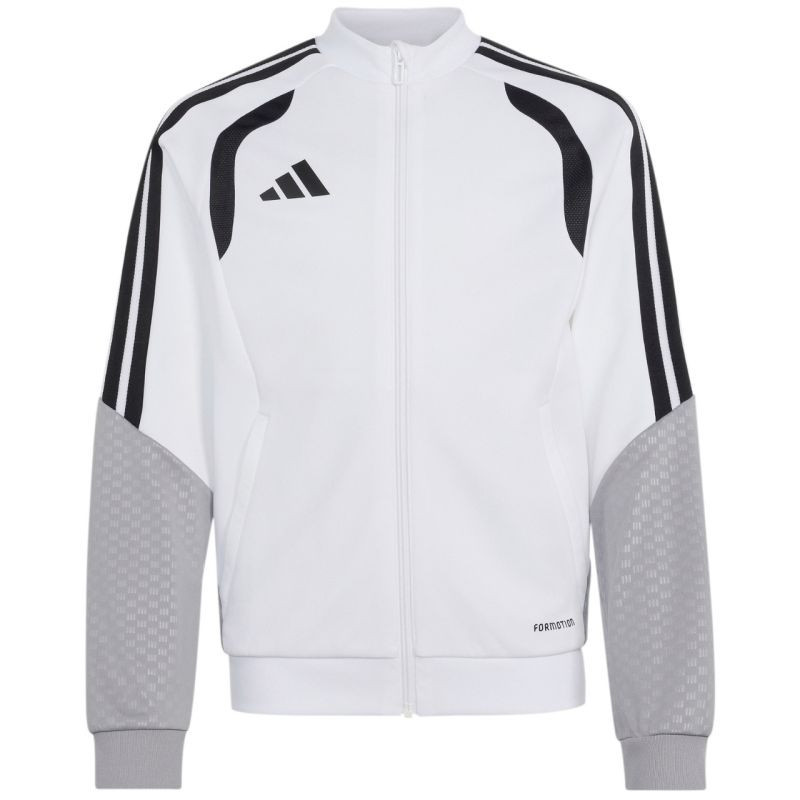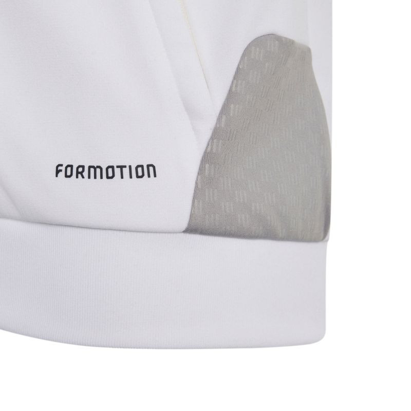 Bluza dla dzieci adidas Tiro 26 Competition Training biało-szara KA7716 Bluza piłkarska adidas przeznaczona dla dzieci sprawdzi się podczas treningów. Stójka. Długi zamek wykończono patką chroniącą podbródek. Dopasowany krój. Technologia Formotion zadba o jeszcze lepszą mobilność. Siateczkowe panele umieszczone na klatce piersiowej. Paski w górnej części rękawów. Mankiety wykończone elastycznymi ściągaczami. Wytłoczone elementy na ramionach i bokach. Materiał: 100% poliester z recyklingu