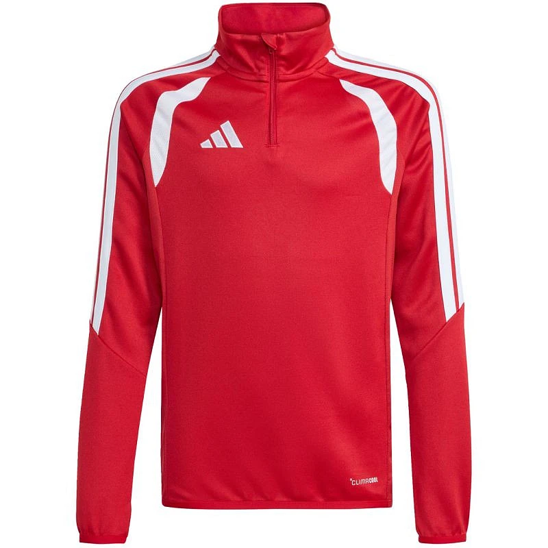 Dětská fotbalová mikina adidas Tiro 26 League Training Top Red/White JY7163 Tato dětská fotbalová mikina adidas je ideální na trénink. Zakončená nášivkou na bradě a krátkým zapínáním na zip. Přiléhavý střih. Technologie Climacool je funkčním řešením, které vás udrží v chladu a suchu a umožní vám soustředit se na hru. Spodní část a manžety zakončené elastickým lemem. Kontrastní síťované vsadky. Pruhy na rukávech. Jemné logo na hrudi. 100% recyklovaný polyester.