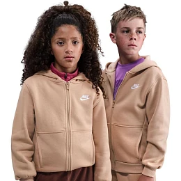 Nike Sportswear Club Fleece Beige FD3004 200 Dětská mikina Nike pro každodenní nošení. bavlněný úplet. syntetická vlákna. měkká podšívka. standardní střih s dlouhými rukávy a žebrovanými manžetami. zip po celé délce. nenastavitelná kapuce. otevřené kapsy pro uložení drobností. vyšívané logo Nike Futura na přední straně. materiál: hlavní část: 80% bavlna, 20% recyklovaný polyester; manžety: 97% bavlna, 3% elastan.