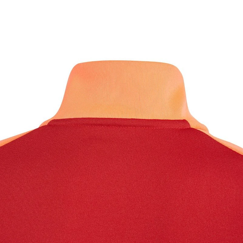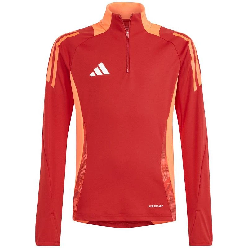 Bluza dla dzieci adidas Tiro 24 Competition Training Top czerwono-pomarańczowa IS1652 Bluza piłkarska adidas przeznaczona dla dzieci sprawdzi się podczas treningów. Stójka ze ściągaczowym wykończeniem. Krótki zamek. Dopasowany krój. Technologia Aeroready pomaga osuszać skórę i zwiększa wygodę. Siateczkowe panele umieszczone na ramionach i po bokach. Paski w górnej części rękawów. Materiał: dzianina o gęstym splocie, 100% poliester z recyklingu