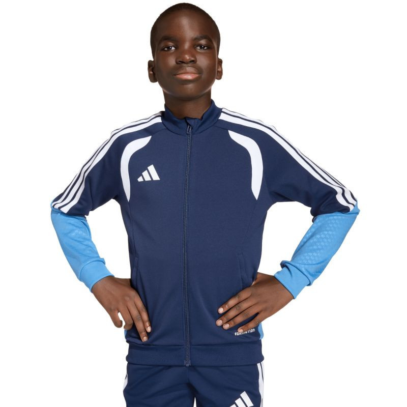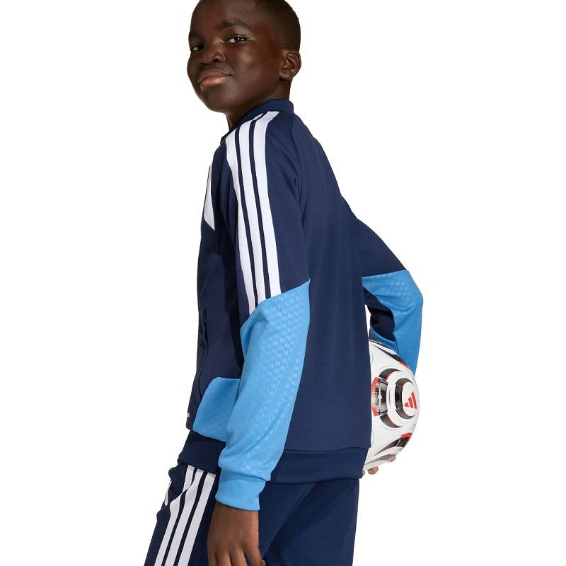Dětská tréninková mikina adidas Tiro 26 Competition v tmavě modré barvě JN2322 Tato dětská fotbalová mikina adidas je ideální na trénink. Stojatý límec. Dlouhý zip s ochrannou nášivkou na bradě. Přizpůsobený střih. Technologie Formotion pro ještě lepší pohyblivost. Síťované panely na hrudi. Pruhy na horních rukávech. Manžety s pružnými rukávy. Reliéfní detaily na ramenou a bocích. Materiál: 100% recyklovaný polyester.