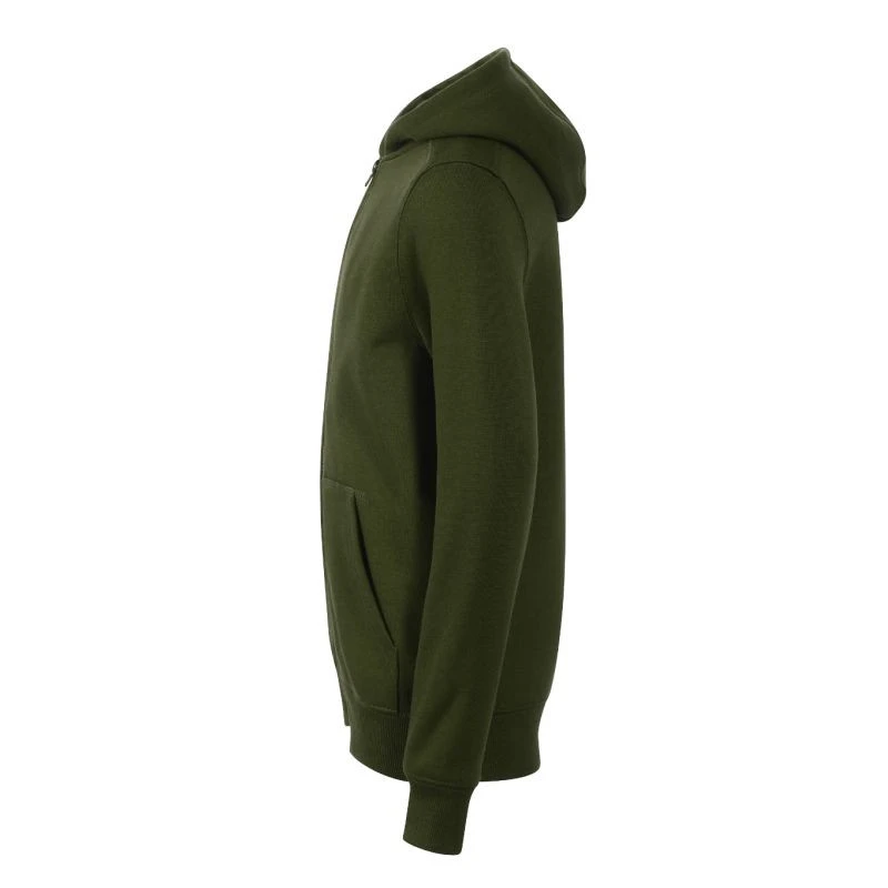 Terry, czesana strona wewnętrzna 65 % bawełna, 35 % poliester prosty krój ze szwami bocznymi, kostkowy zamek błyskawiczny na całej długości, kaptur z podszewką bez sznurka ściągającego, lamówka na karku wzmocniona kontrastową taśmą, kieszenie naszyte typu kangurka, dolny ściągacz i mankiety rękawów z dzianiny ściągaczowej 2:2 z dodatkiem 5 % elastanu, czesana strona wewnętrzna
