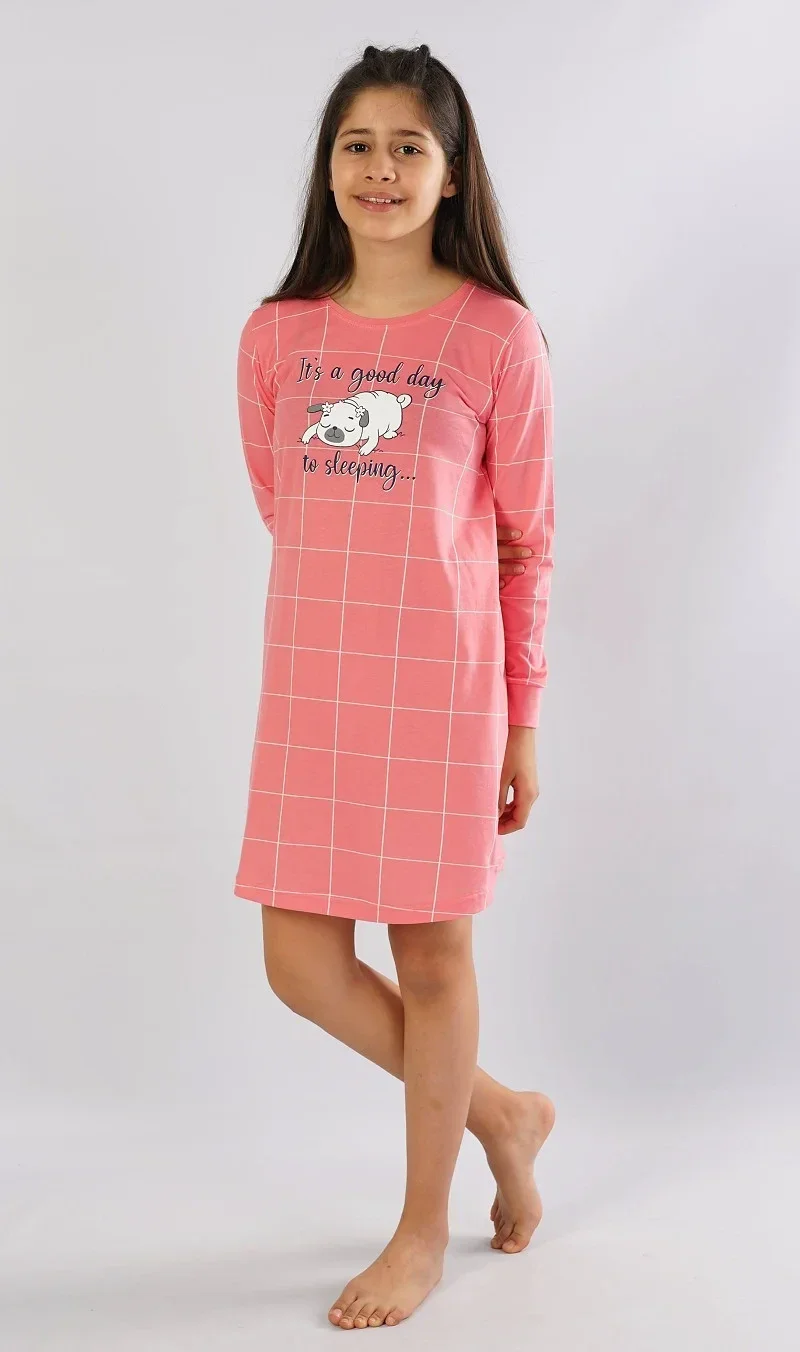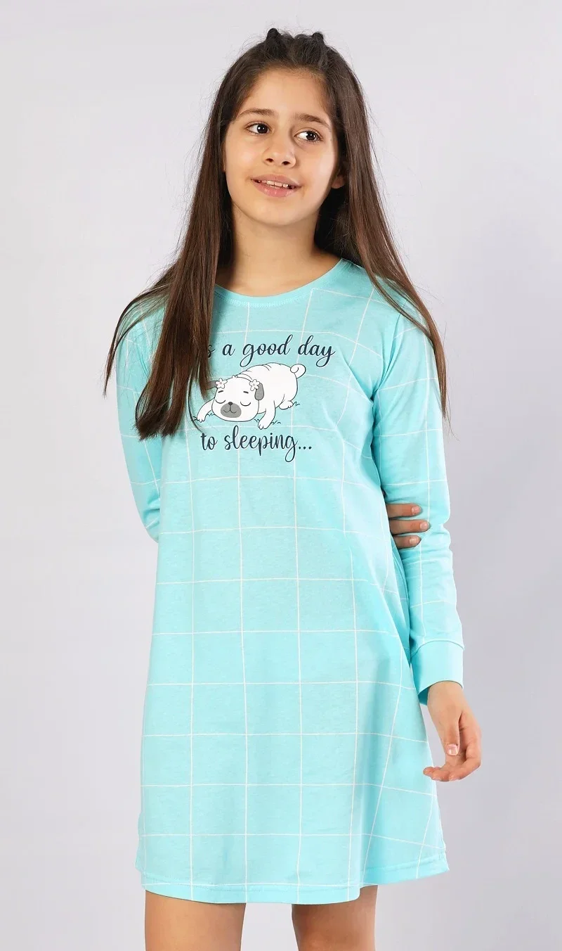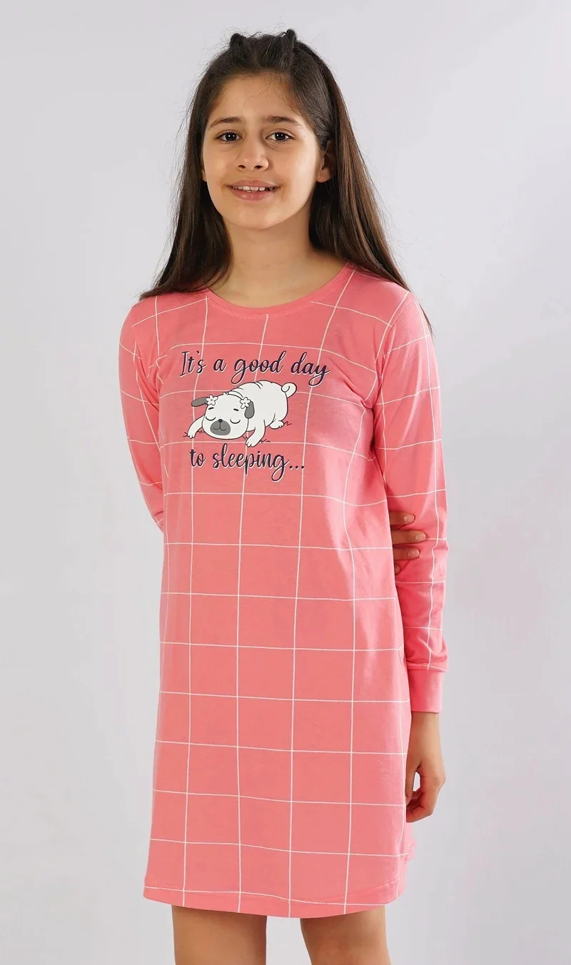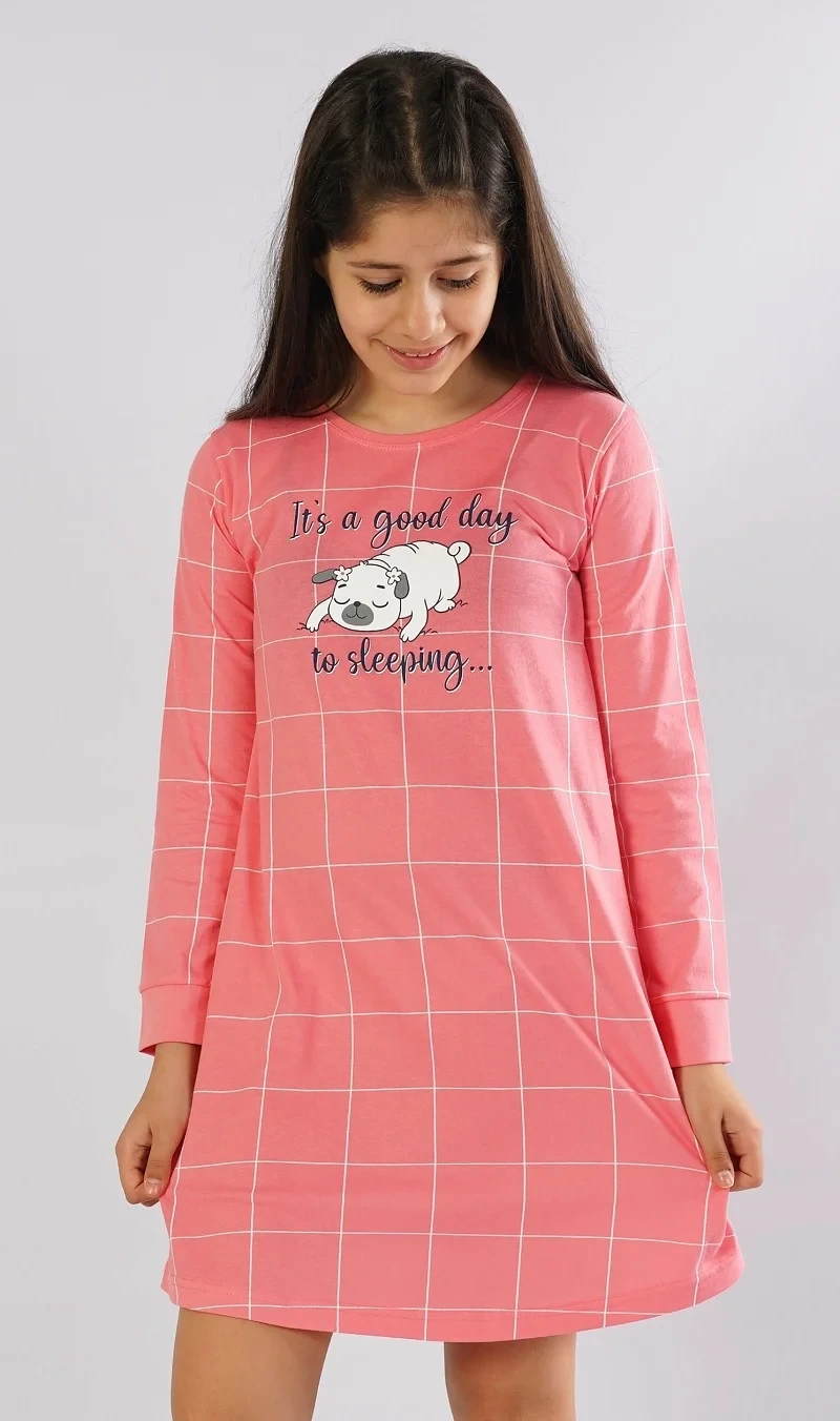 Dětská noční košile s dlouhým rukávem Ospalec. Dětská noční košile s dlouhým rukávem je má na mřížkovaném podkladu je obrázek spícího buldočka, kolem kterého je nápis A good day to sleeping... Použitý materiál je jemný a poddajný na dotek. Kšile je vhodná i na denní nošení.