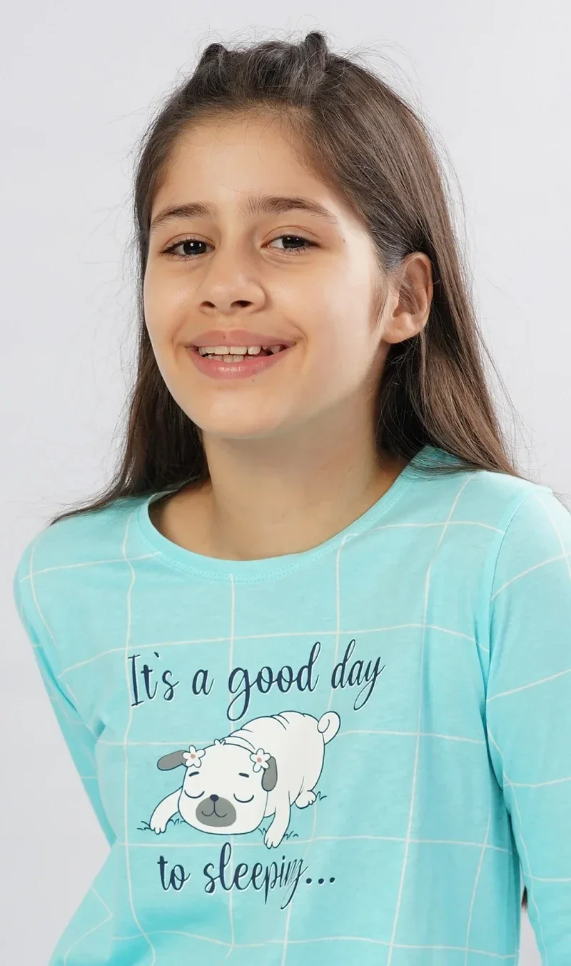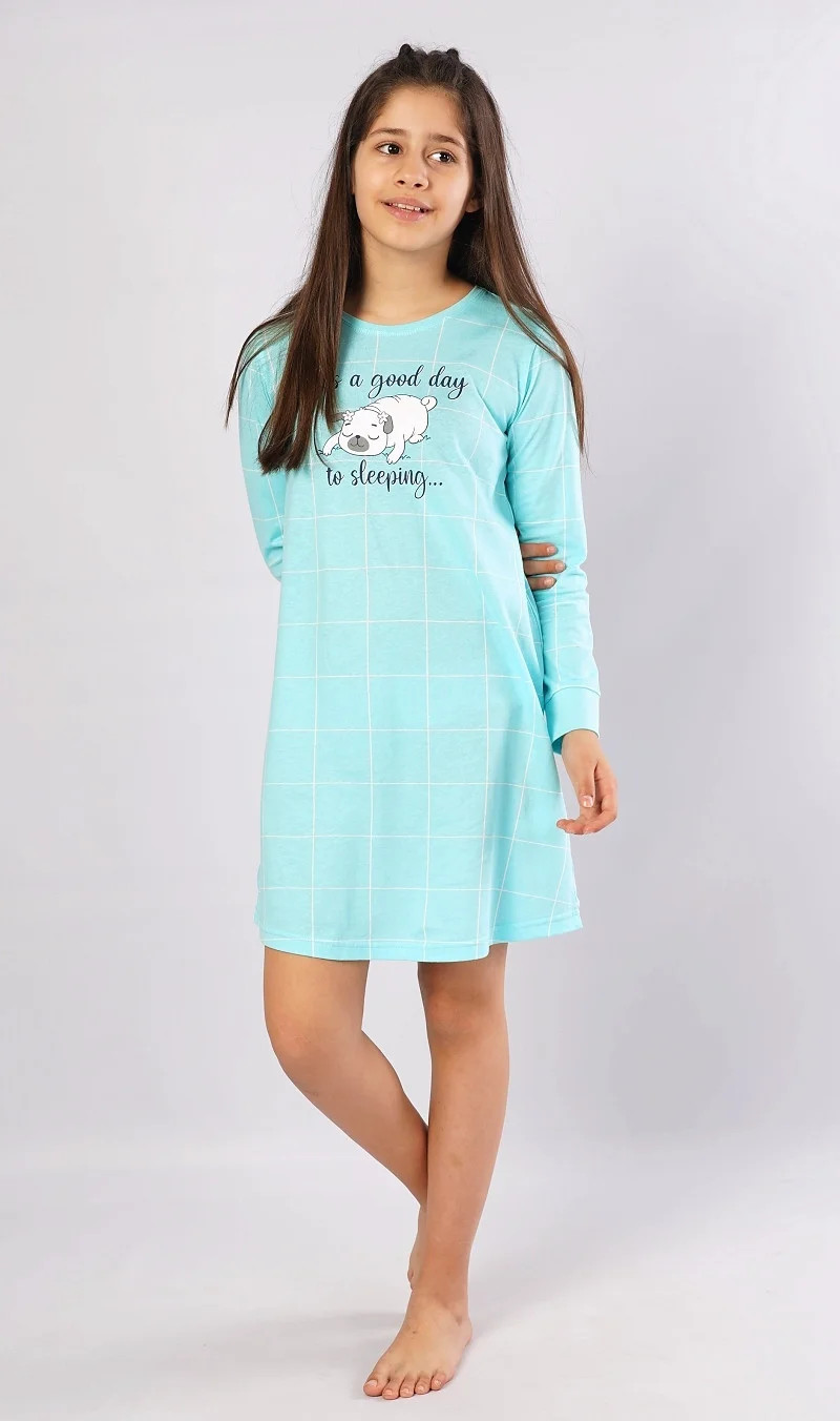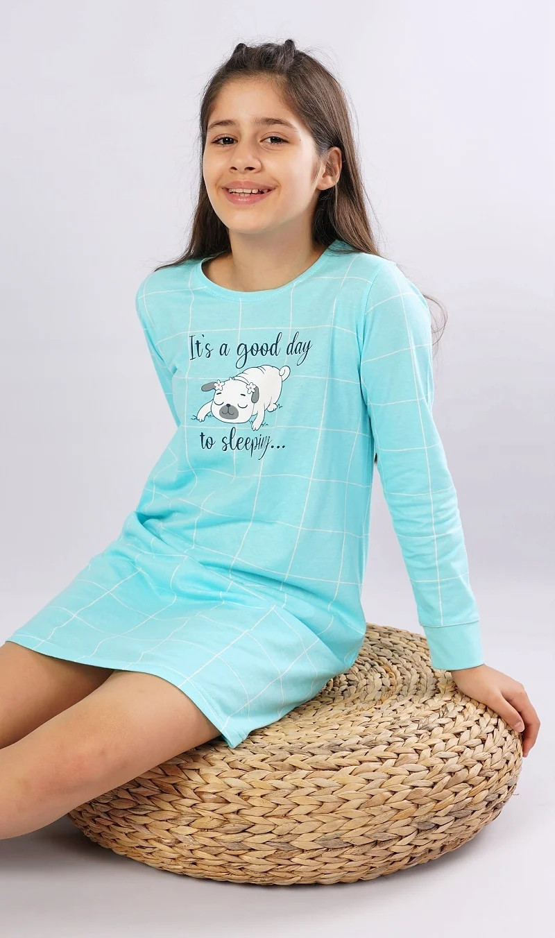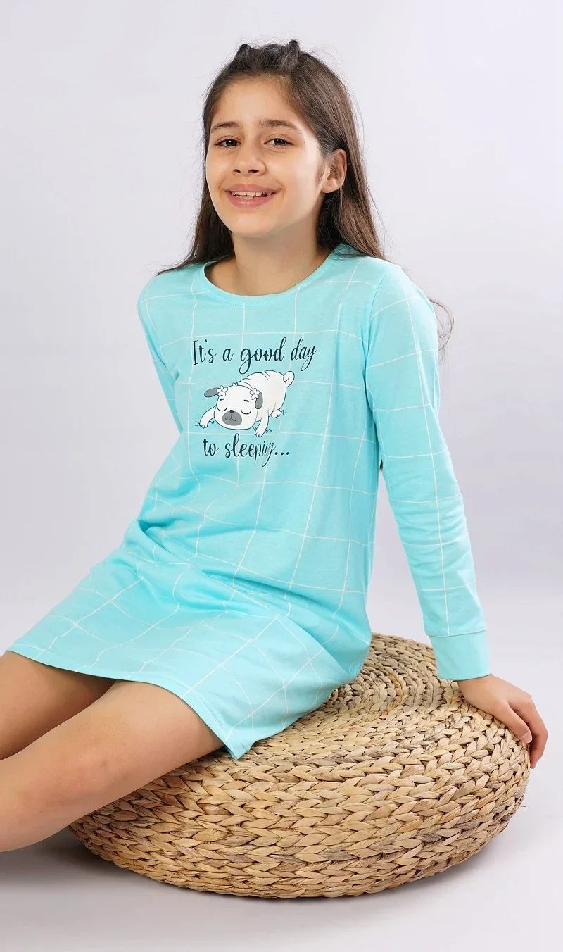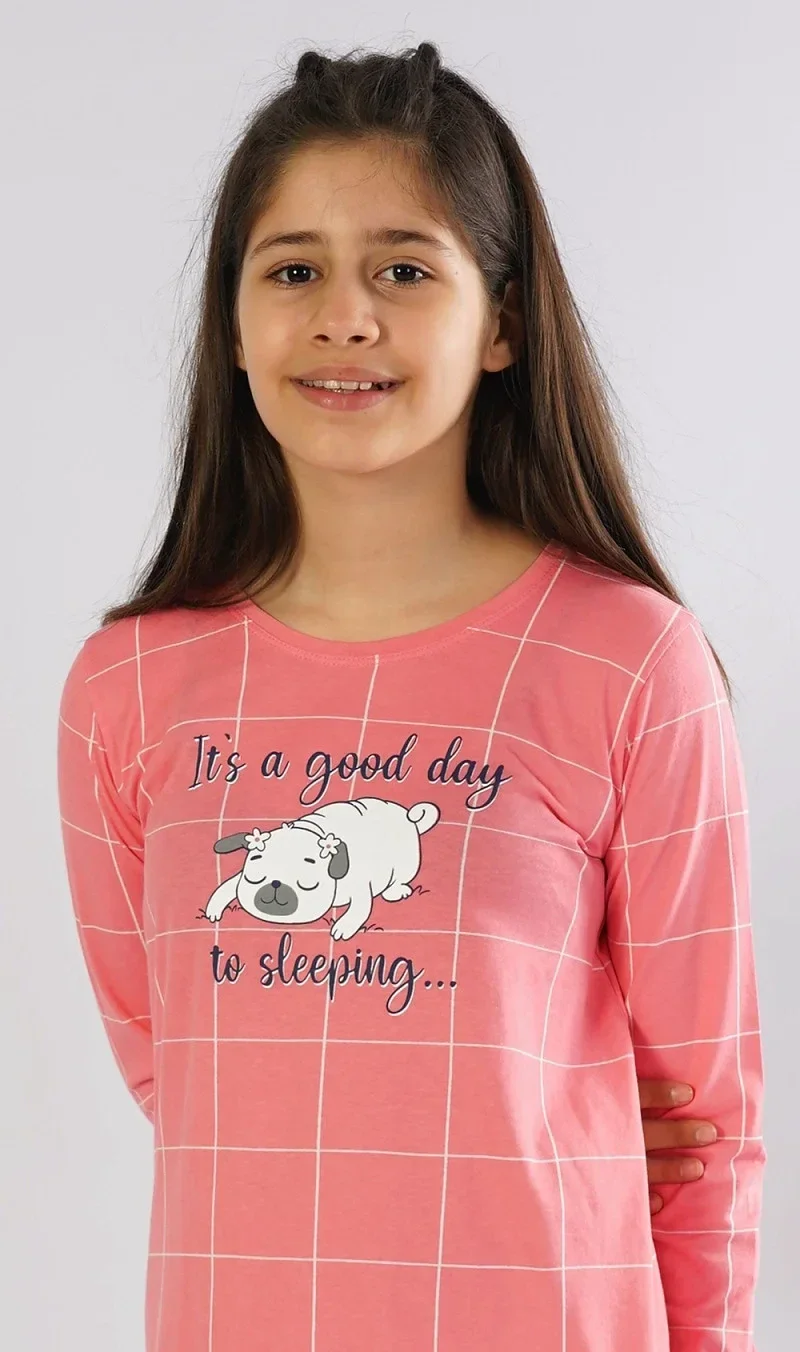 Dětská noční košile s dlouhým rukávem Ospalec. Dětská noční košile s dlouhým rukávem je má na mřížkovaném podkladu je obrázek spícího buldočka, kolem kterého je nápis A good day to sleeping... Použitý materiál je jemný a poddajný na dotek. Kšile je vhodná i na denní nošení.