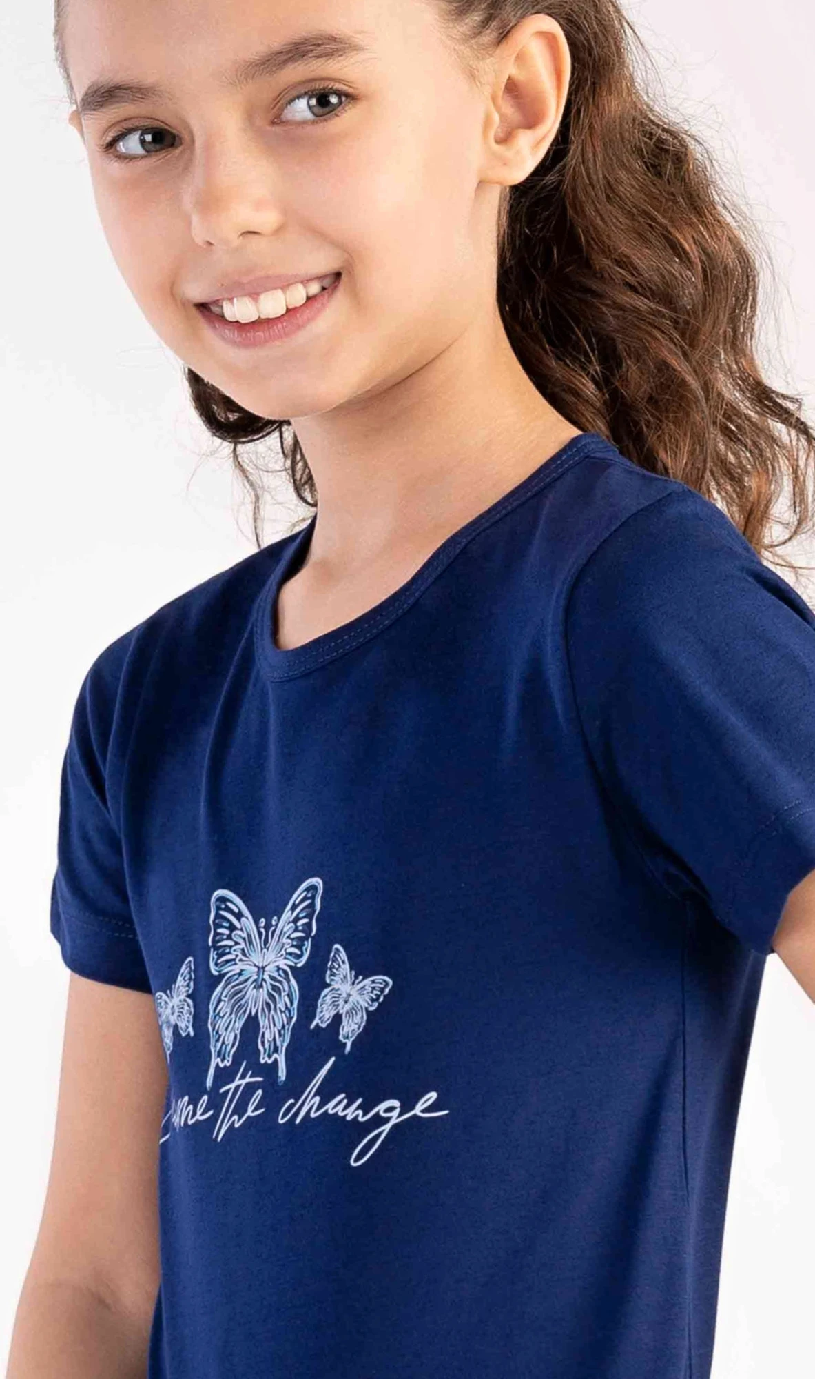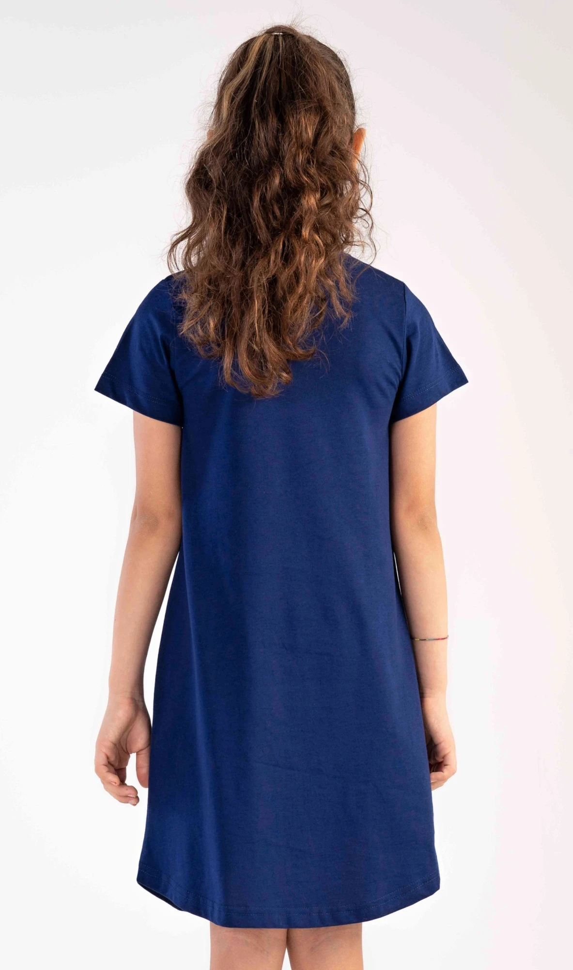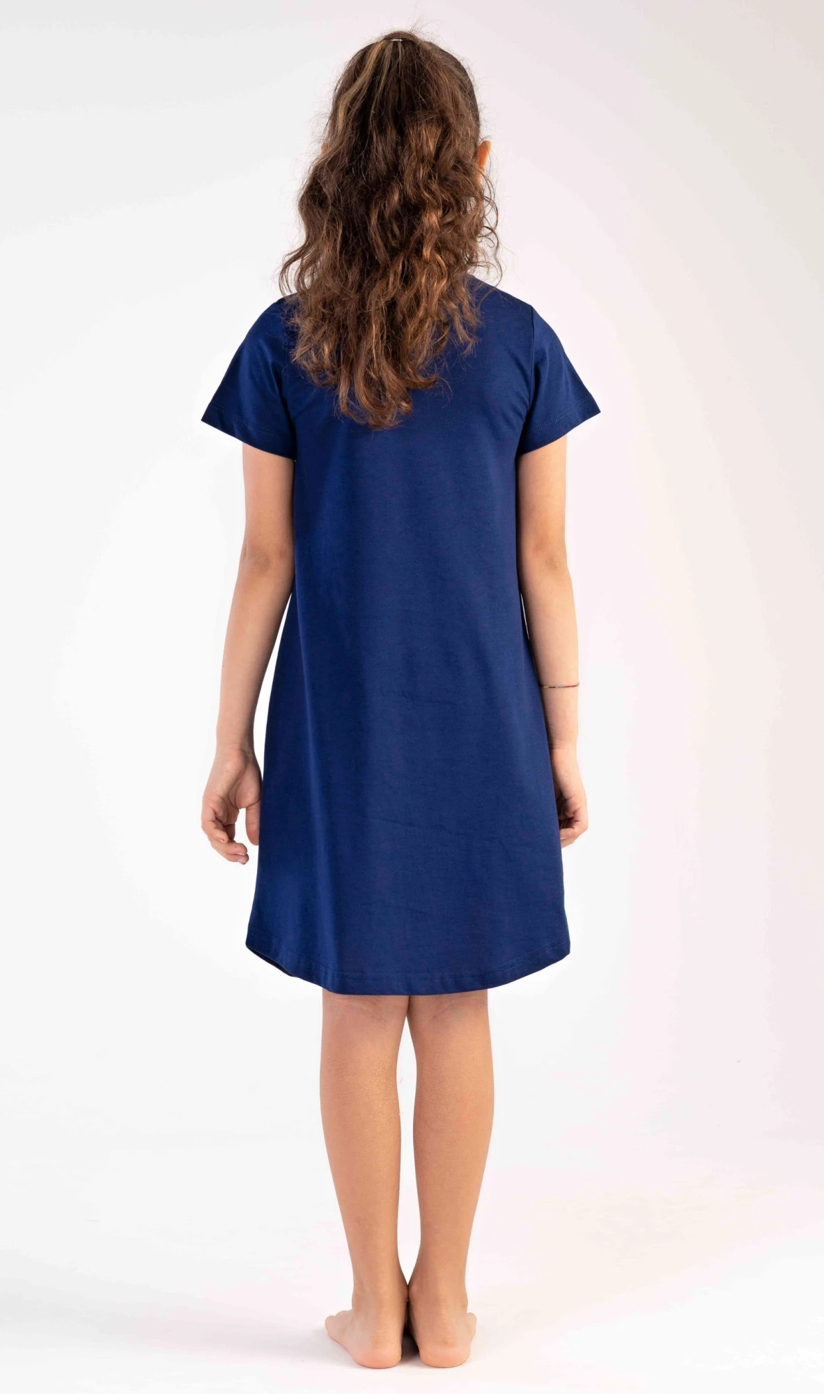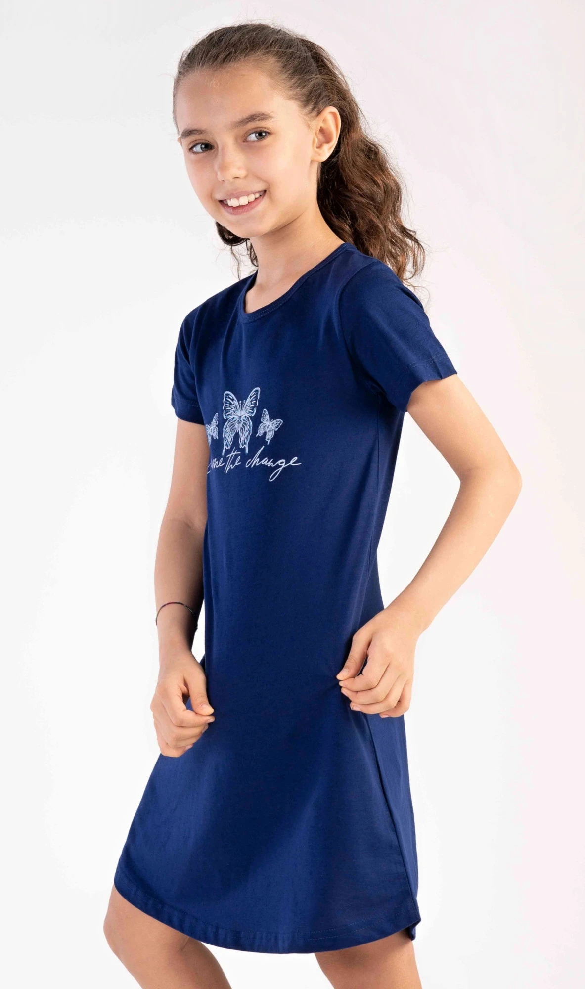 Dětská bavlněná noční košile s krátkým rukávem Butterfly. Na jednobarevné košilce s krátkým rukávem je obrázek tří motýlků. Použitý bavlněný materiál je poddajný a příjemný na dotek.