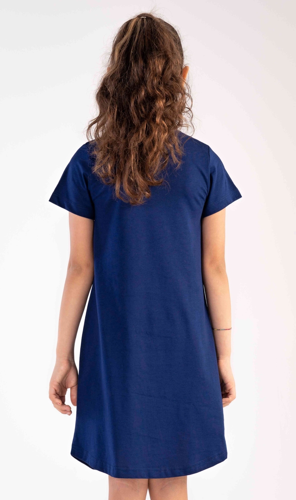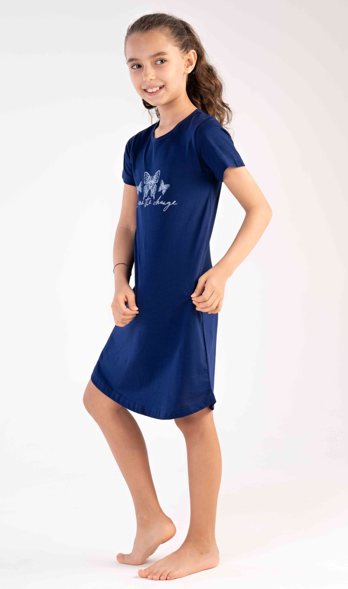 Dětská bavlněná noční košile s krátkým rukávem Butterfly. Na jednobarevné košilce s krátkým rukávem je obrázek tří motýlků. Použitý bavlněný materiál je poddajný a příjemný na dotek.