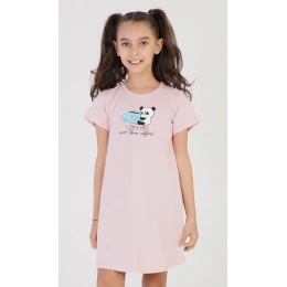 Dětská bavlněná noční košile s krátkým rukávem I love you. Na jednobarevné košilce s krátkým rukávem je obrázek medvídka pandy s hrníčkem a nápis I LOVE YOU. Použitý materiál je poddajný a příjemný na dotek.