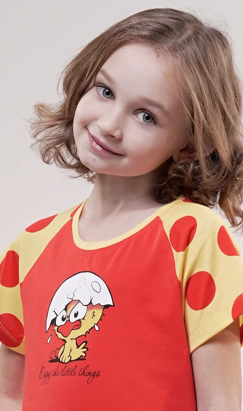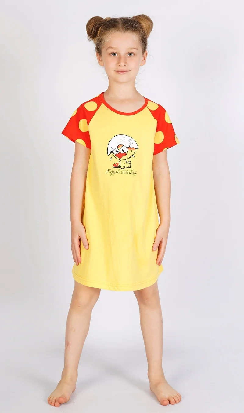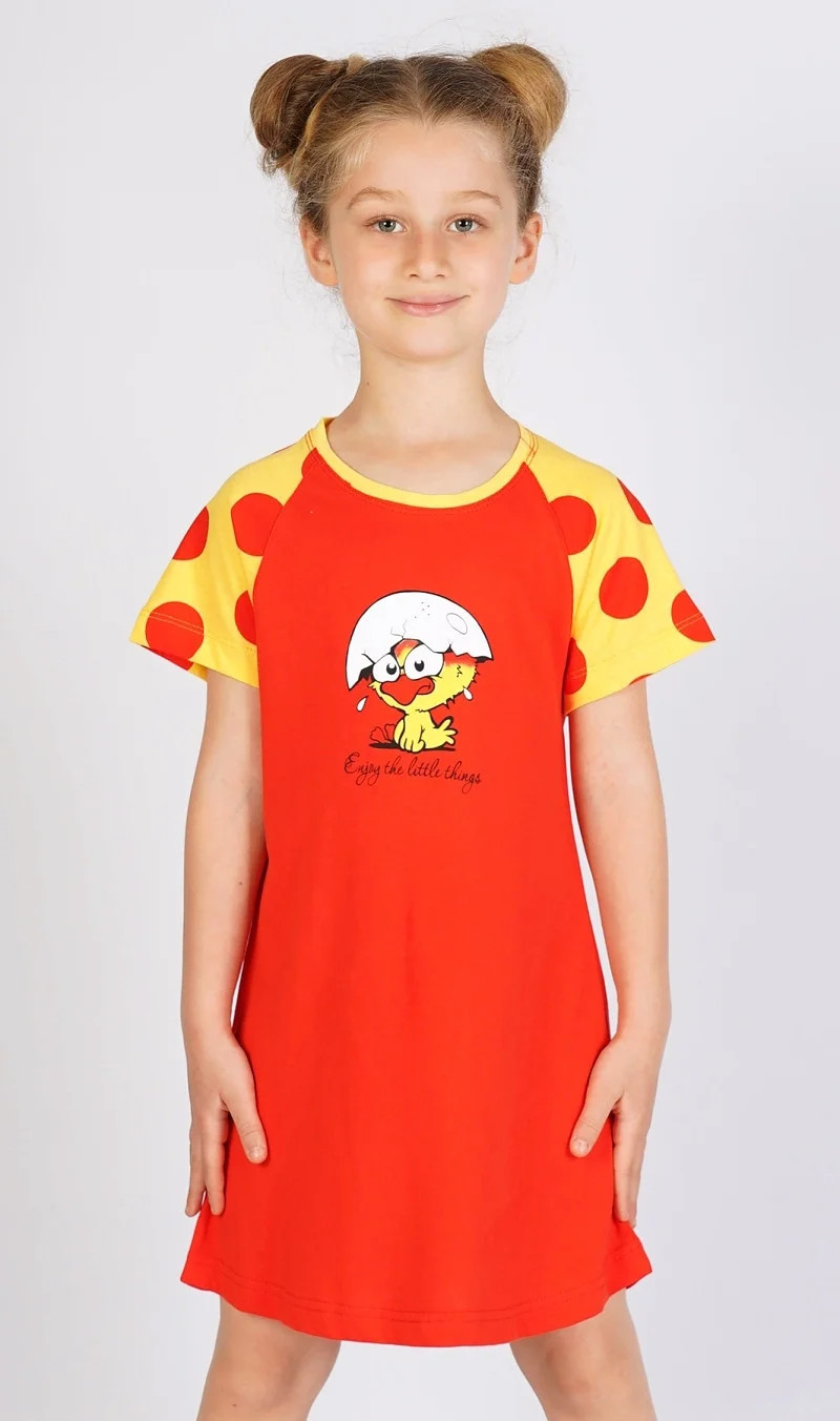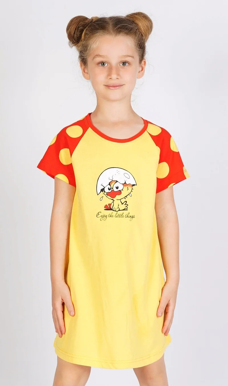 Dětská noční košile s krátkým rukávem Malé kuře. Dětská noční košile má pohledově odlišené rukávy s velkými barevnými puntíky na světlém podkladu. Na jednobarevném podkladu samotné košile je obrázek roztomilého kuřátka se skořápkou na hlavě, pod kterým je nápis Enjoy the little things. Použitý materiál je jemný a poddajný na dotek. Košile je vhodná i na denní nošení.