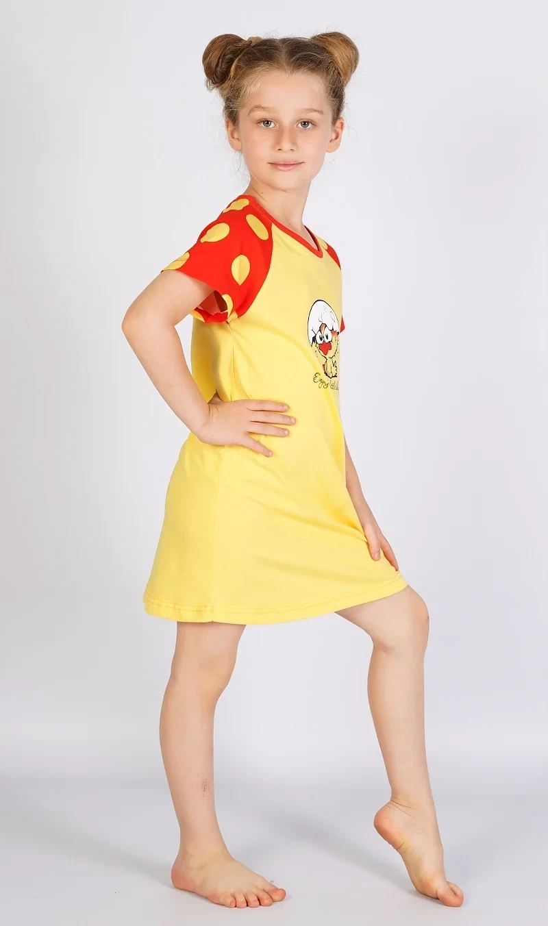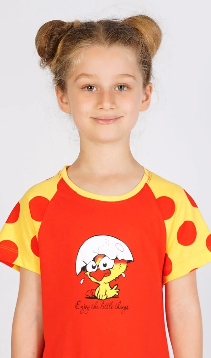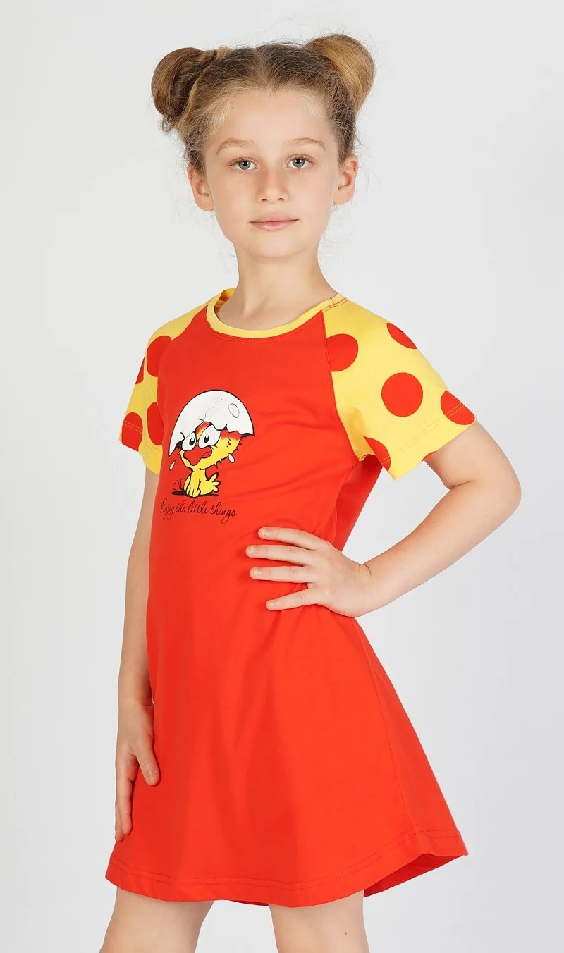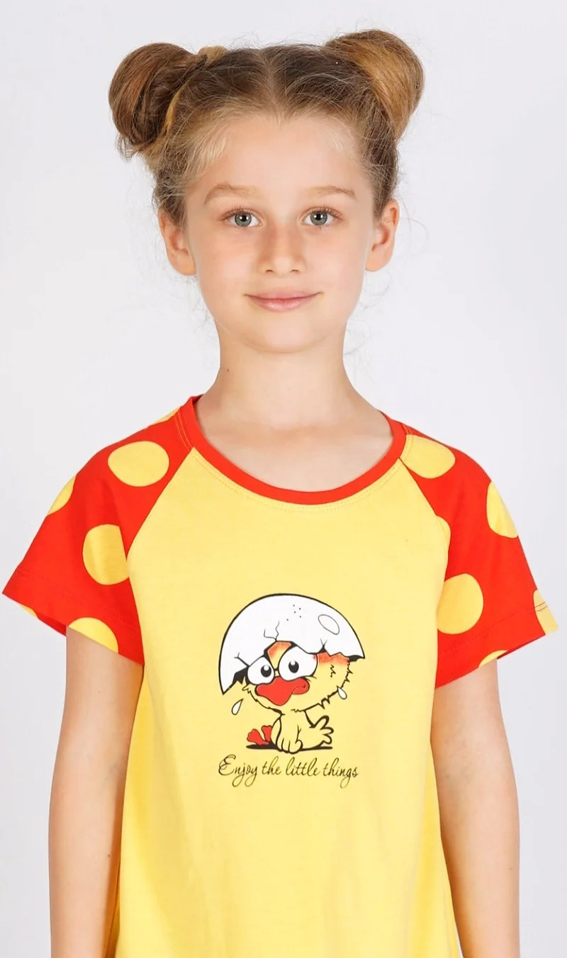 Dětská noční košile s krátkým rukávem Malé kuře. Dětská noční košile má pohledově odlišené rukávy s velkými barevnými puntíky na světlém podkladu. Na jednobarevném podkladu samotné košile je obrázek roztomilého kuřátka se skořápkou na hlavě, pod kterým je nápis Enjoy the little things. Použitý materiál je jemný a poddajný na dotek. Košile je vhodná i na denní nošení.