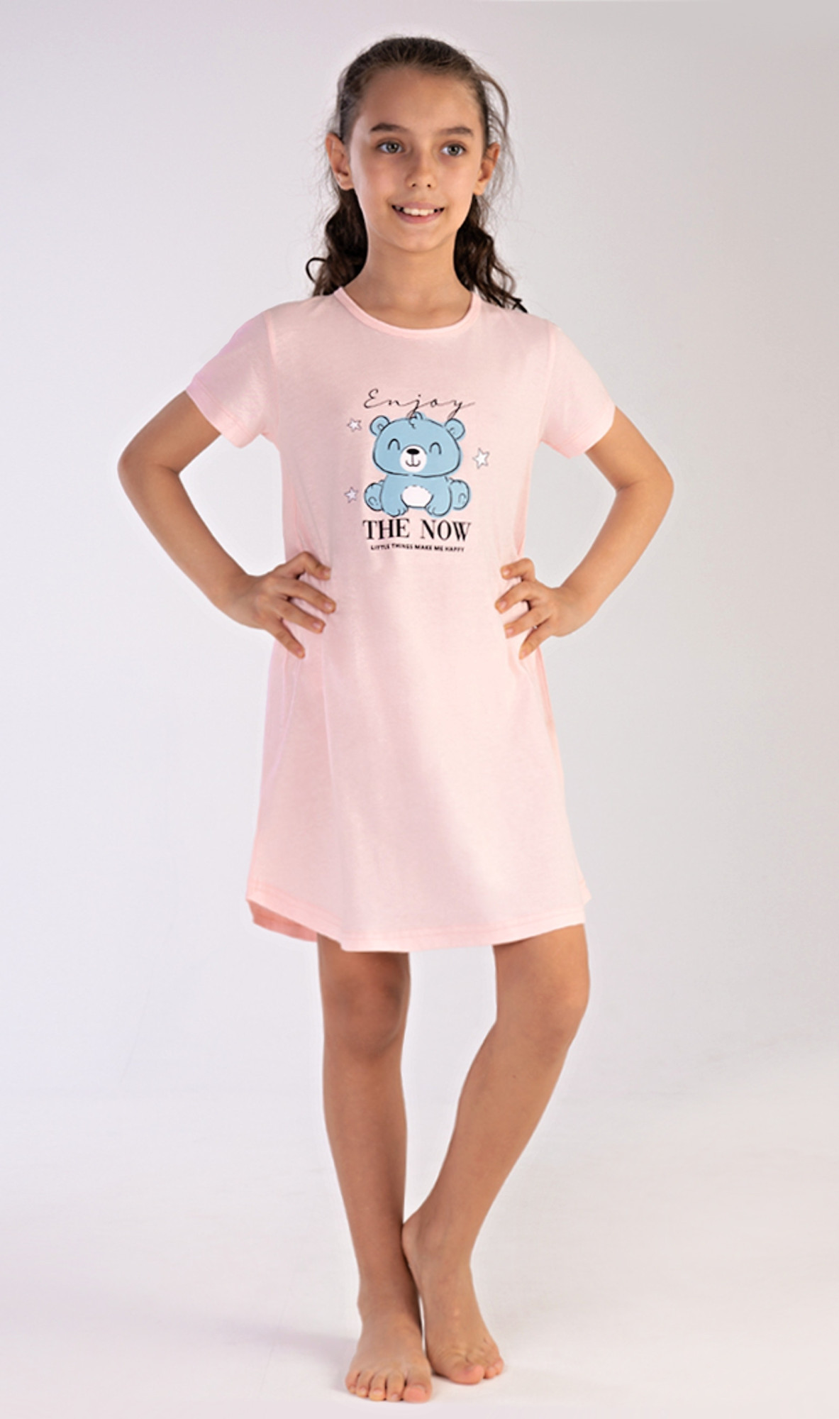 Dětská bavlněná noční košile s krátkým rukávem Enjoy. Na jednobarevné košilce s krátkým rukávem je obrázek medvídka a nápis 'Enjoy the now'. Použitý bavlněný materiál je poddajný a příjemný na dotek.