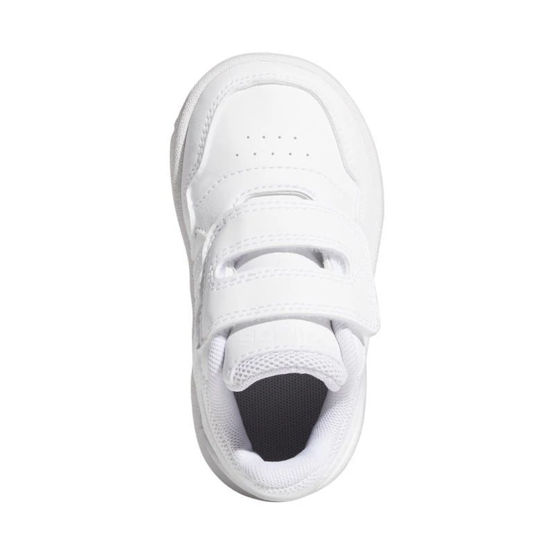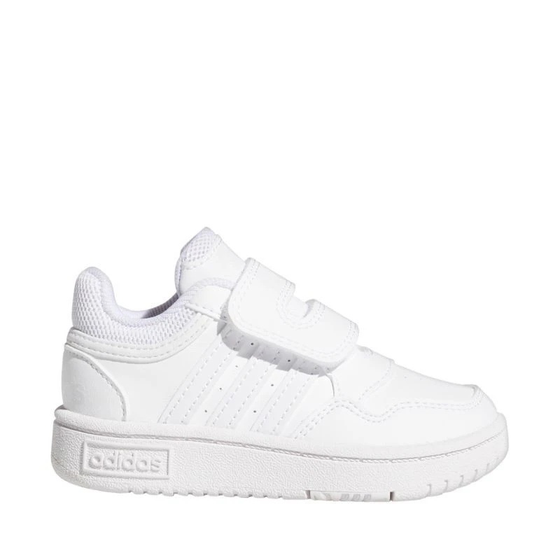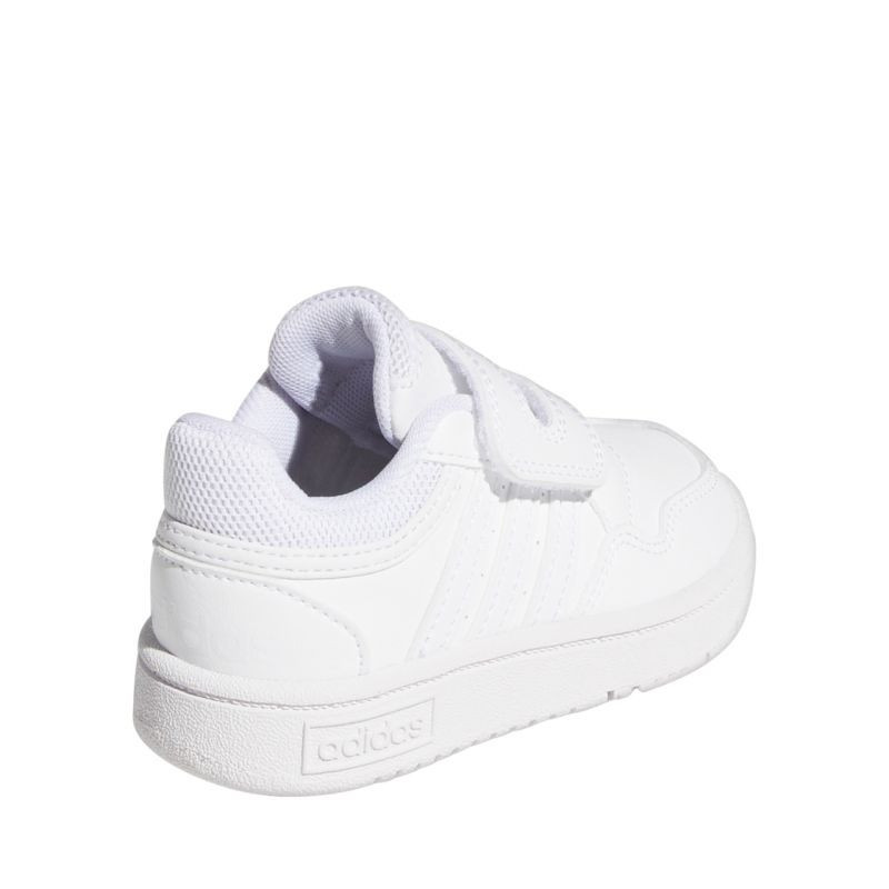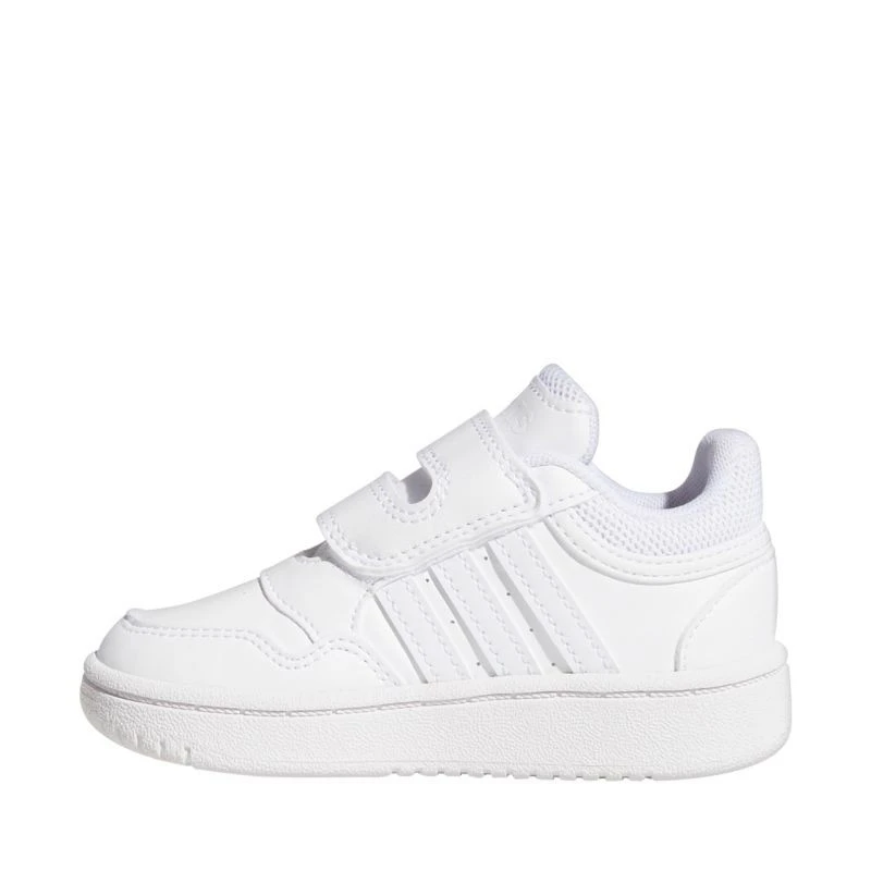 Dětské boty adidas Hoops 3.0 white GW0442 Dětské boty adidas jsou ideální pro každodenní nošení. Svršek ze syntetické kůže pohodlně odpružuje chodidlo. Textilní podšívka. Pásek na suchý zip. Měkké textilní lemování na límci. Gumová podrážka na platformě. Přilnavý došlap.