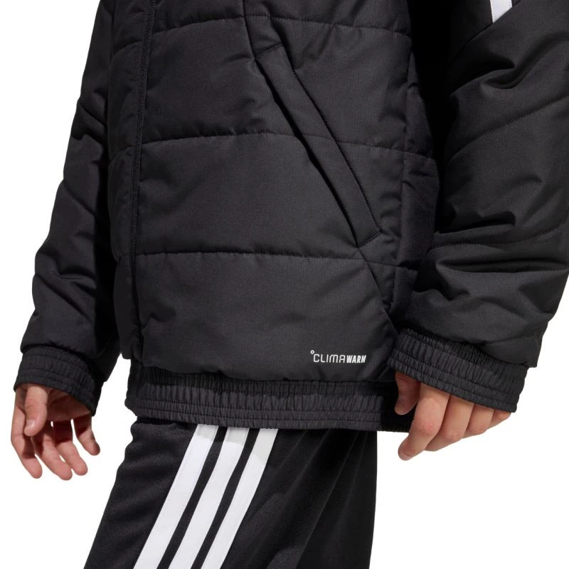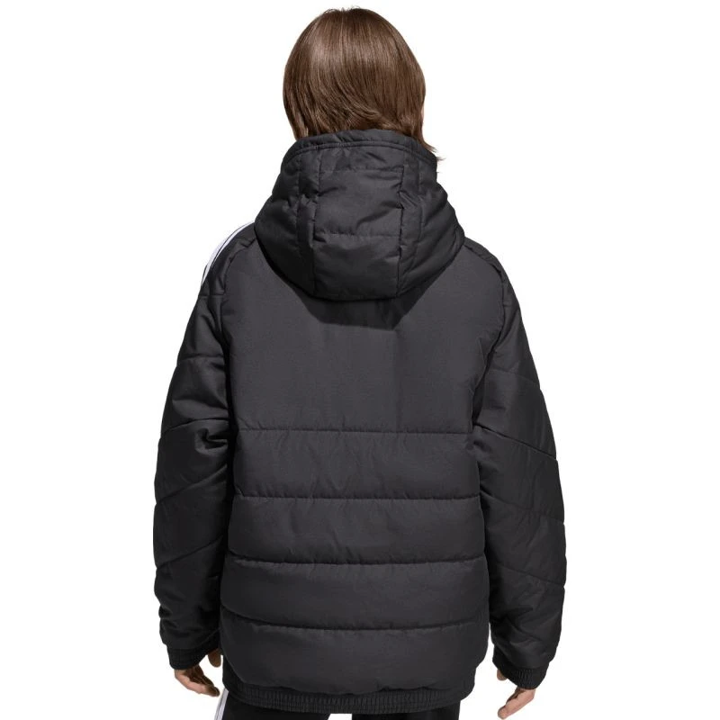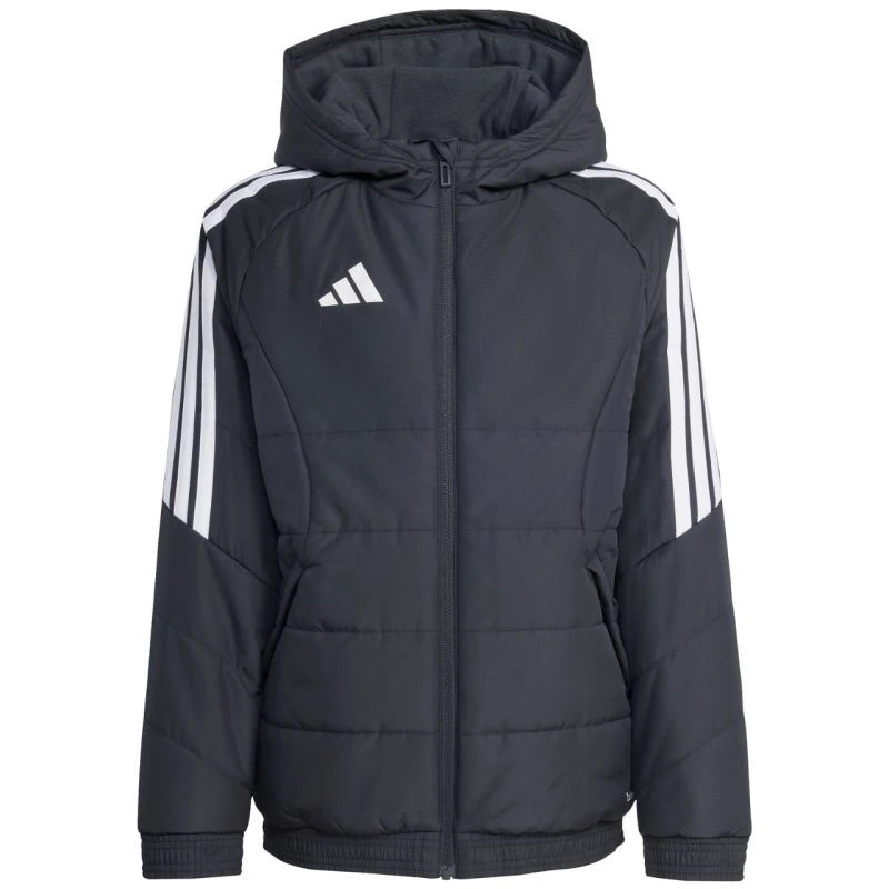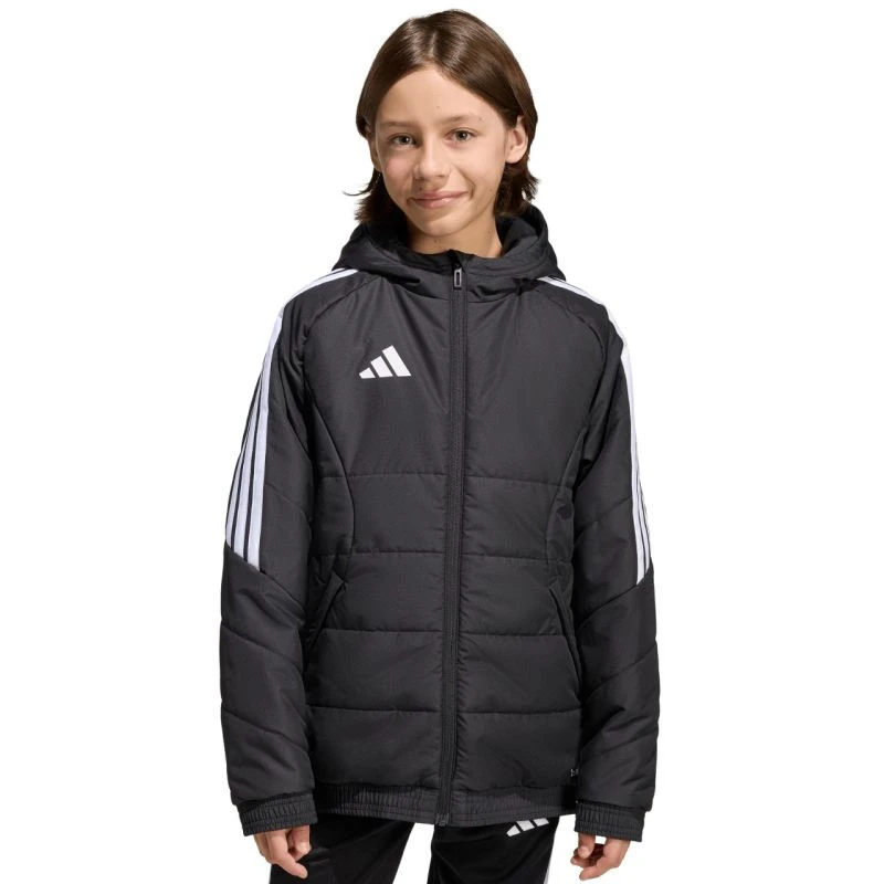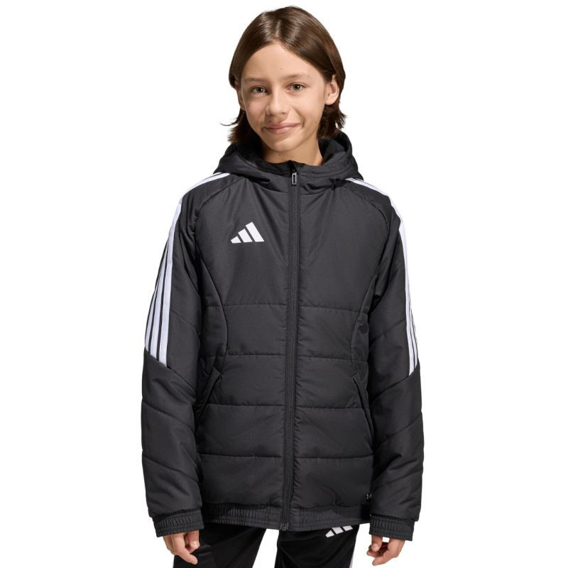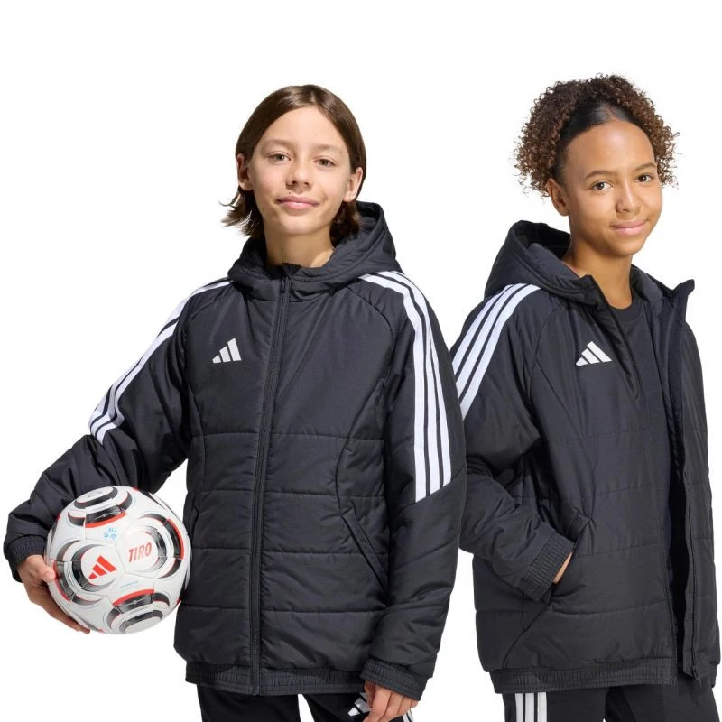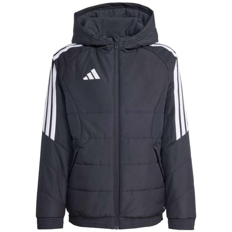 Dětská bunda adidas Tiro 26 Winter black KA5319 Dětská bunda adidas z fotbalové řady Tiro je vhodná i pro každodenní nošení. Syntetická výplň rovnoměrně rozložená v horizontálních širokých panelech pomáhá udržovat optimální tělesnou teplotu. Tradiční střih. Zip po celé délce. Boční kapsy na zip. Elastické lemování manžet a spodního lemu. Neodnímatelná, nenastavitelná kapuce nasazená na vysokém límci. Pruhy na rukávech. Subtilní logo na přední straně. Technologie Climawarm. Hydrofobní vlastnosti vnější vrstvy. Větruodolná tkanina. Vnější tkanina: 100% recyklovaný polyesterVýplň: 100% recyklovaný polyester.
