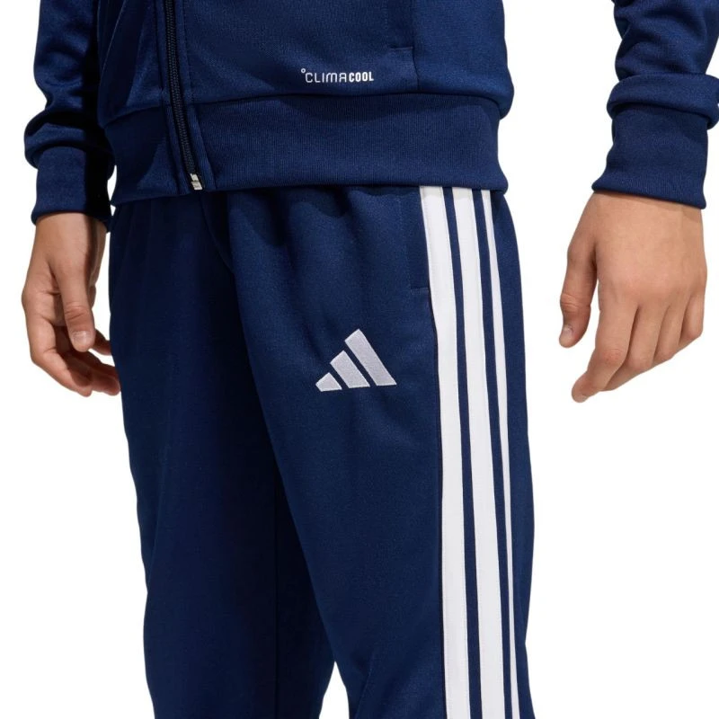 Dětské fotbalové kalhoty adidas Tiro 26 League Training Regular v tmavě modré barvě JY9675 Dětské fotbalové kalhoty adidas Tiro jsou ideální na trénink. Dvojitá pletenina s rychleschnoucími vlastnostmi. Technologie Climacool absorbuje a odvádí pot, abyste zůstali v chladu a suchu. Pravidelný střih. Elastický pas do poloviny pasu se stahovací šňůrkou pro nastavení. Boční kapsy se zipy. Konce nohavic se zipy. Materiál: 100% recyklovaný polyester.