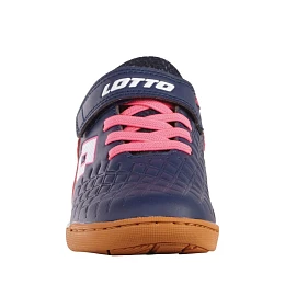 Buty dla dzieci Lotto Dasher granatowo-różowe 2600920K 5944 Buty dla dzieci Lotto to model, który sprawdzi się na co dzień i treningów na hali. Teksturowana cholewka wykonana z ekologicznej skóry jest trwała i łatwa w utrzymaniu w czystości. Elastyczne gumki przypominające klasyczne sznurowanie wsparte zapięciem na rzep pozwalają na dopasowanie obuwia do stóp. Gumowa podeszwa z tłoczeniem zapewnia odpowiednią przyczepność do podłoża.