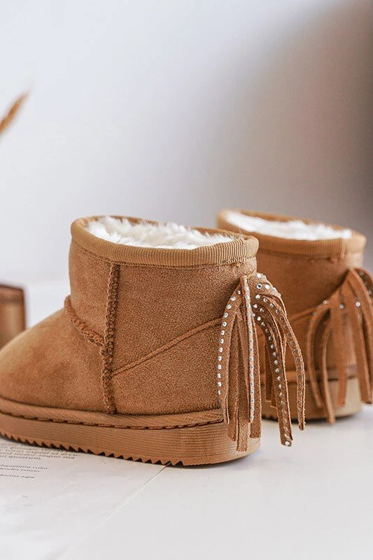 Dětské sněhové boty vyrobené z eko semiše. Vnitřek zateplený silnou vlnou zajistí vašemu dítěti teplo. Boty jsou osazeny na podešvi z gumového materiálu. Zadní část boty ozdobena flitrem. Tento model by měl být nezbytnou součástí šatníku vašeho dítěte!