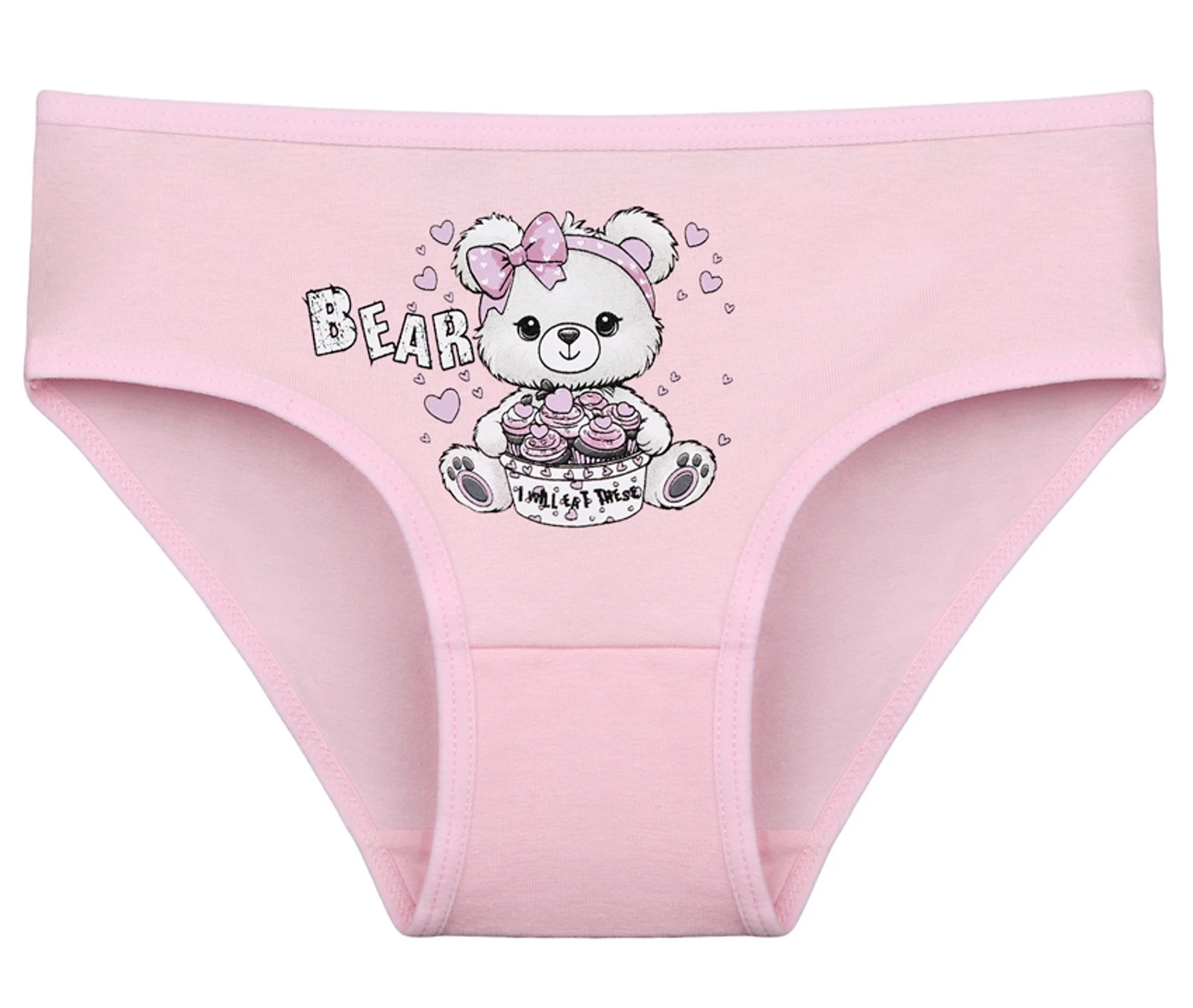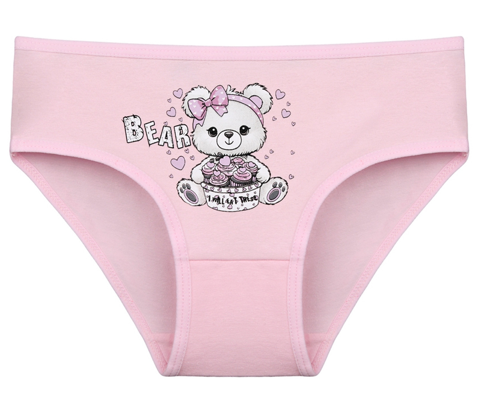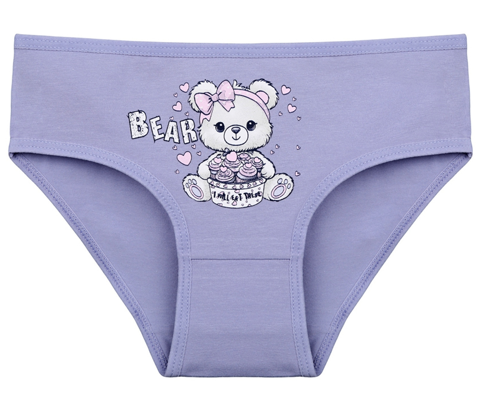 Dětské bavlněné kalhotky Bear. Dětské kalhotky klasického střihu jsou pohodlné a slušivé, zdobí je obrázek medvídka. Obzvláště oceníte materiálové složení - 95% bavlna a 5% elasten. Použitý materiál je příjemný a poddajný na dotek.