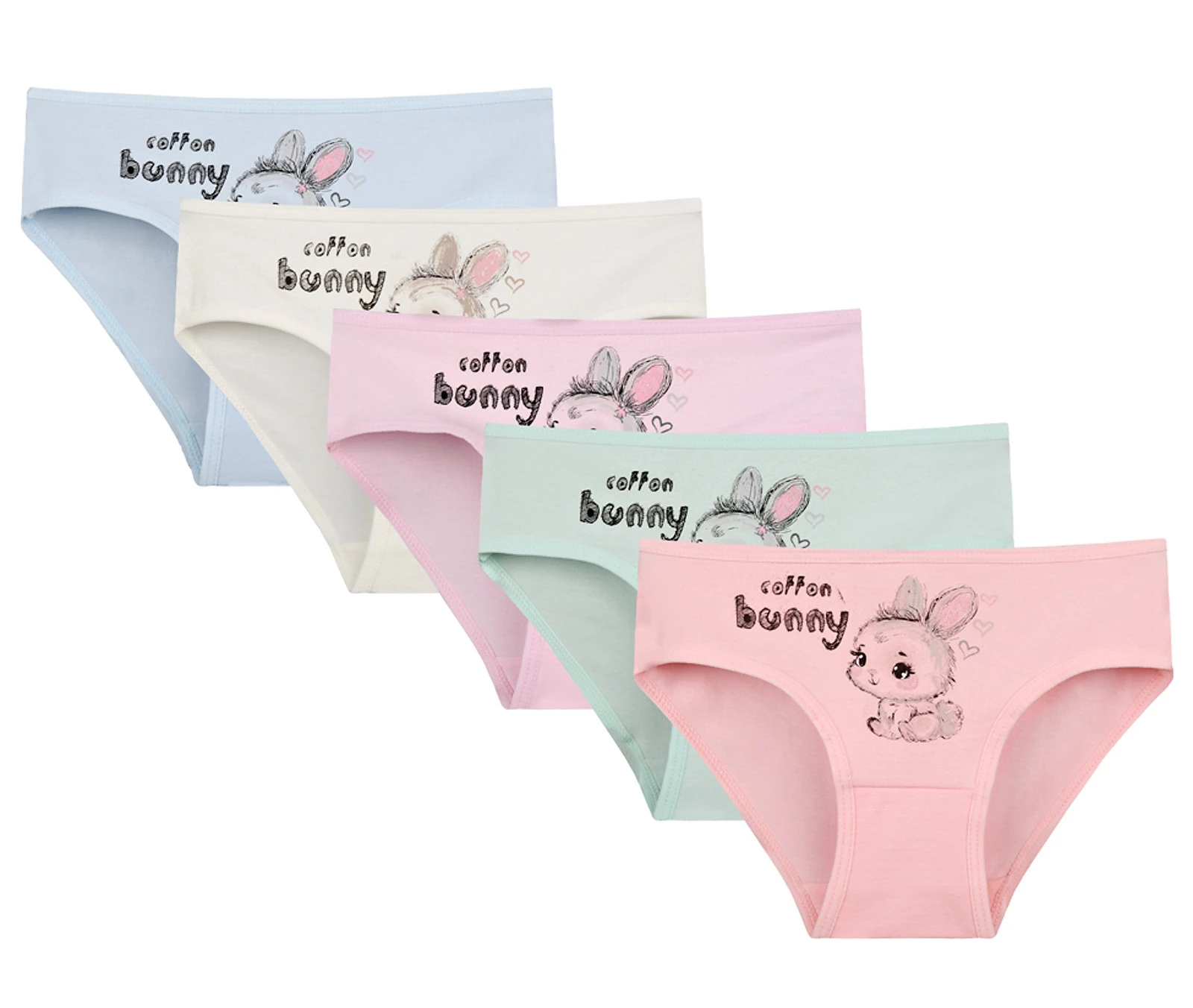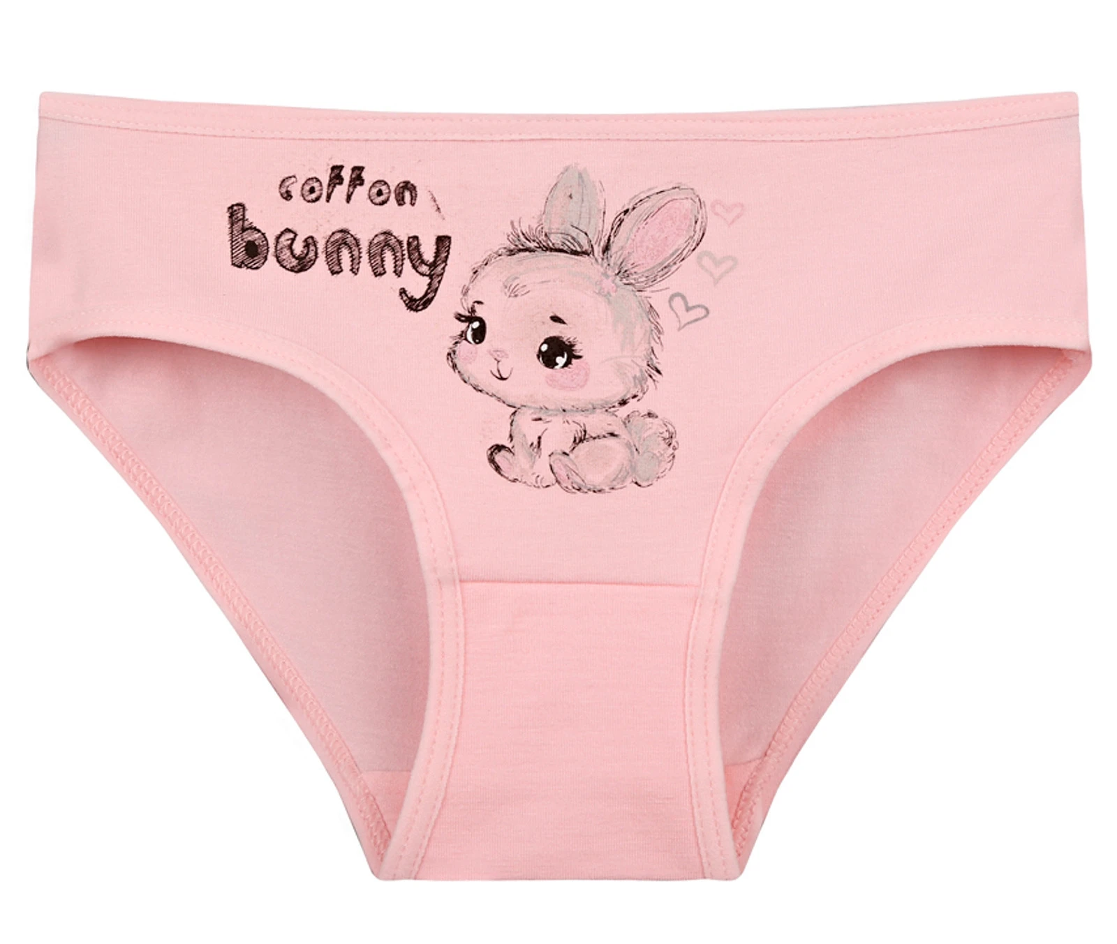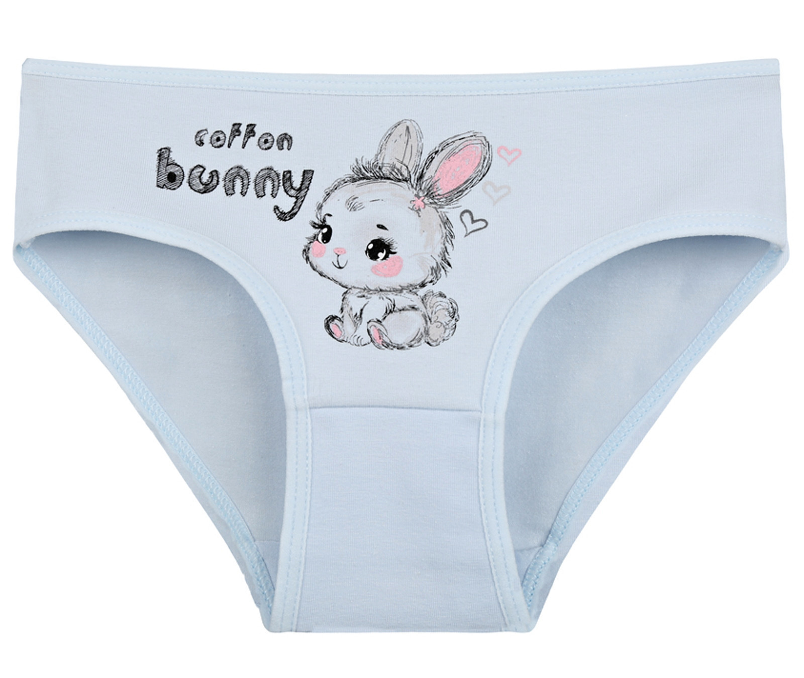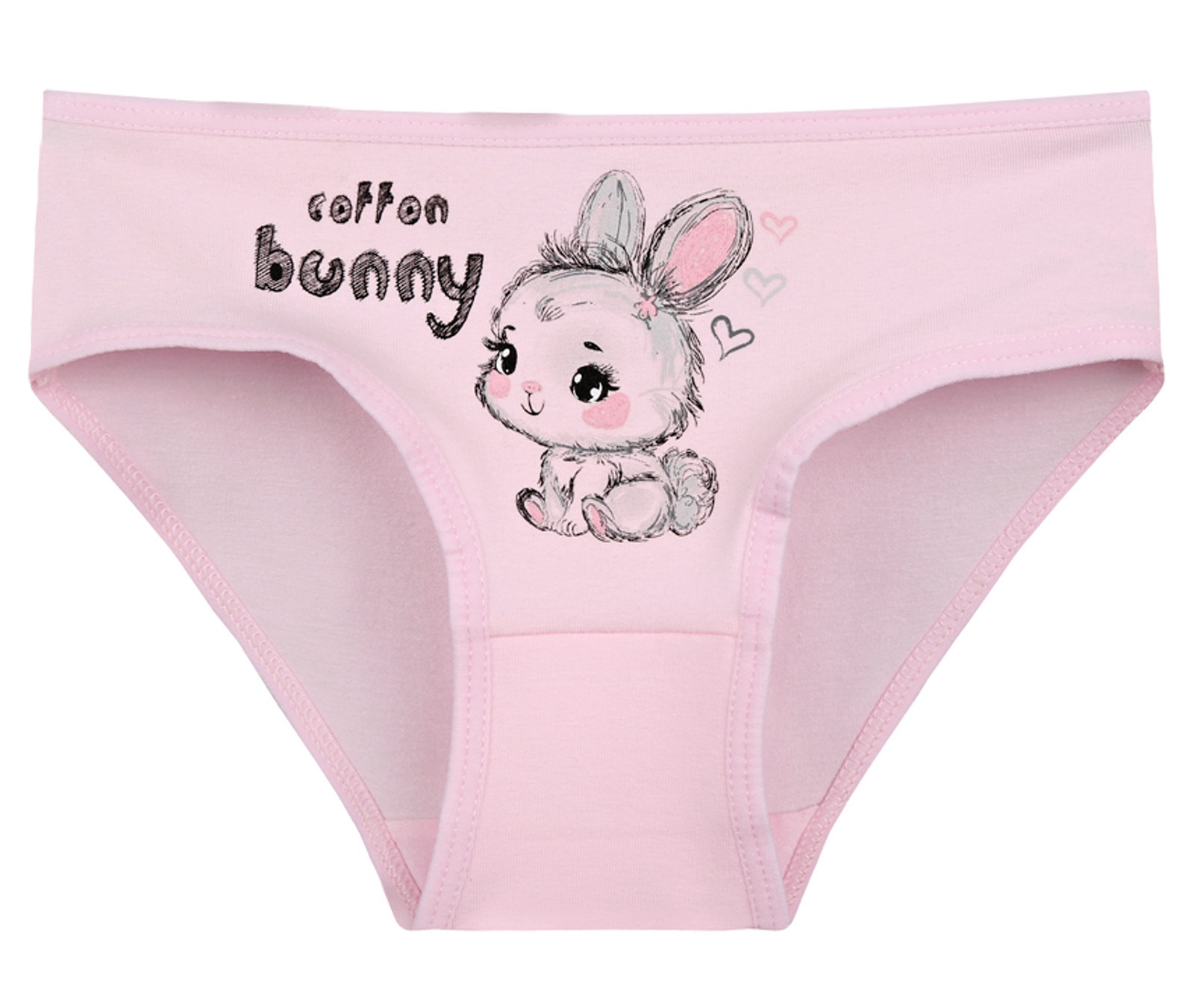 Dětské bavlněné kalhotky Bunny. Dětské kalhotky klasického střihu jsou pohodlné a slušivé, zdobí je obrázek malého králíčka a nápis 'cotton bunny'. Obzvláště oceníte materiálové složení - 95% bavlna a 5% elasten. Použitý materiál je příjemný a poddajný na dotek.