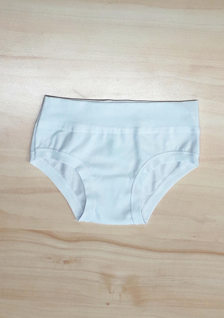 Dětské kalhotky Emy. Velmi příjemný a pružný materiál dívčích kalhotek v bílé barvě. Střih kalhotek je klasický a pas je vyšší. Horní obvod i obvod nohaviček jsou volně přeloženy, proto se kalhotky nezařezávají a jsou tak velmi příjemné na nošení. Do vnitřního dílu je zapracován bavlněný klínek.