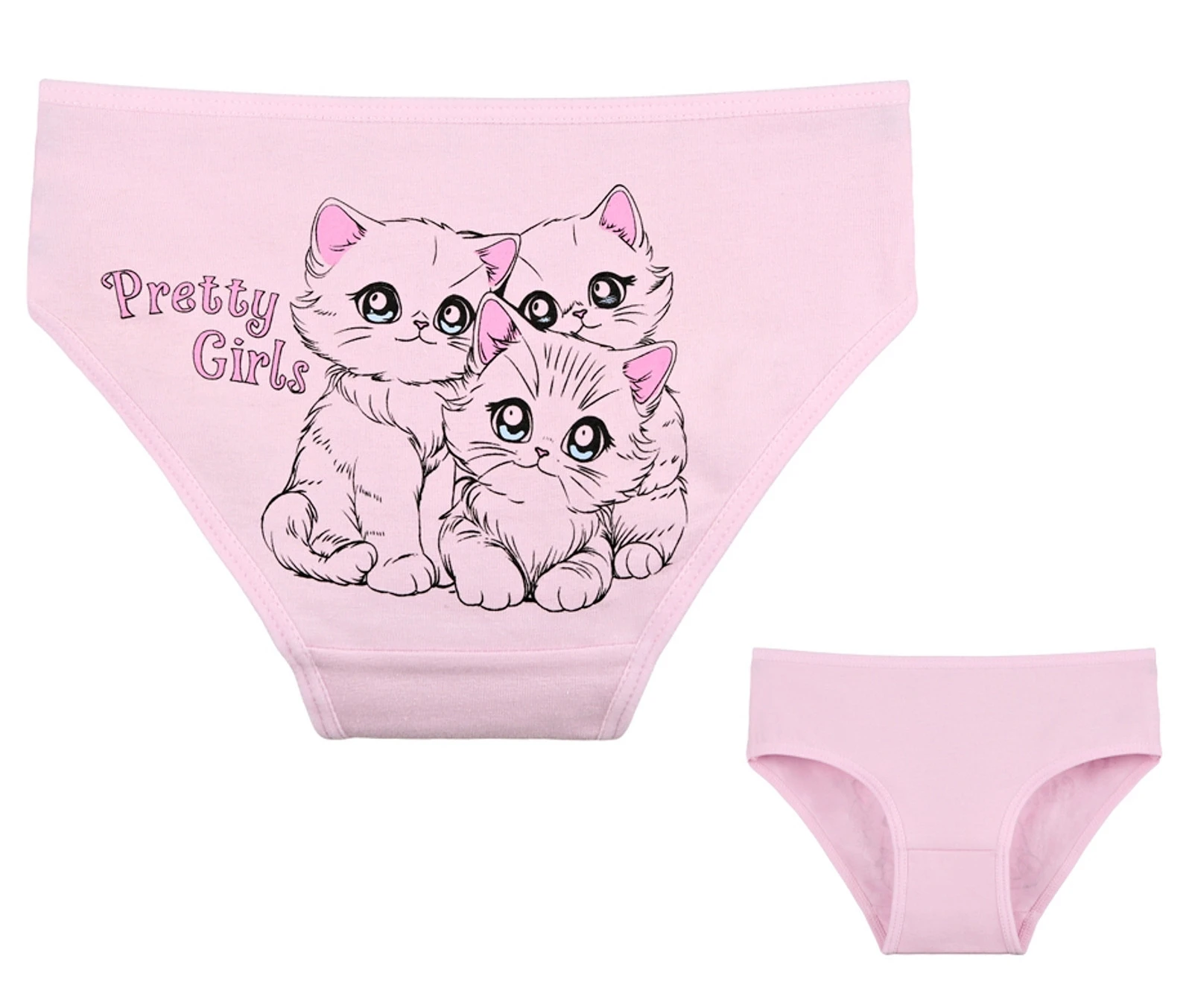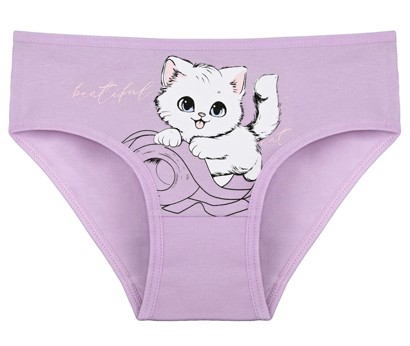 Dětské bavlněné kalhotky Kočička. Dětské kalhotky klasického střihu jsou pohodlné a slušivé, zdobí je obrázek kotěte. Obzvláště oceníte materiálové složení - 95% bavlna a 5% elasten. Použitý materiál je příjemný a poddajný na dotek.