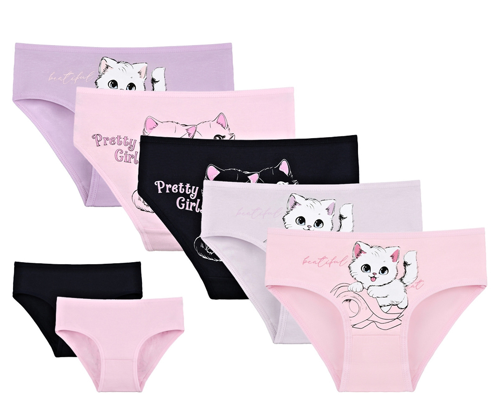 Dětské bavlněné kalhotky Kočička. Dětské kalhotky klasického střihu jsou pohodlné a slušivé, zdobí je obrázek kotěte. Obzvláště oceníte materiálové složení - 95% bavlna a 5% elasten. Použitý materiál je příjemný a poddajný na dotek.