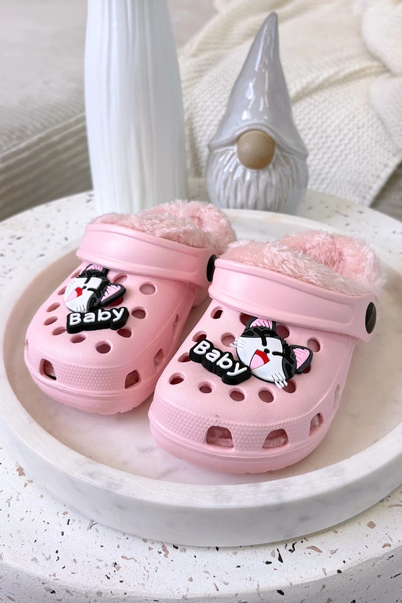Dětské pantofle z lehkého pěnového materiálu jsou zateplené měkkým kožíškem, který zajišťuje teplo a pohodlí při nošení doma. Ozdobné připínky dodávají pantoflím hravý vzhled, který si děti rychle oblíbí. Růžové provedení působí jemně a veselě, ideální pro chladnější dny.