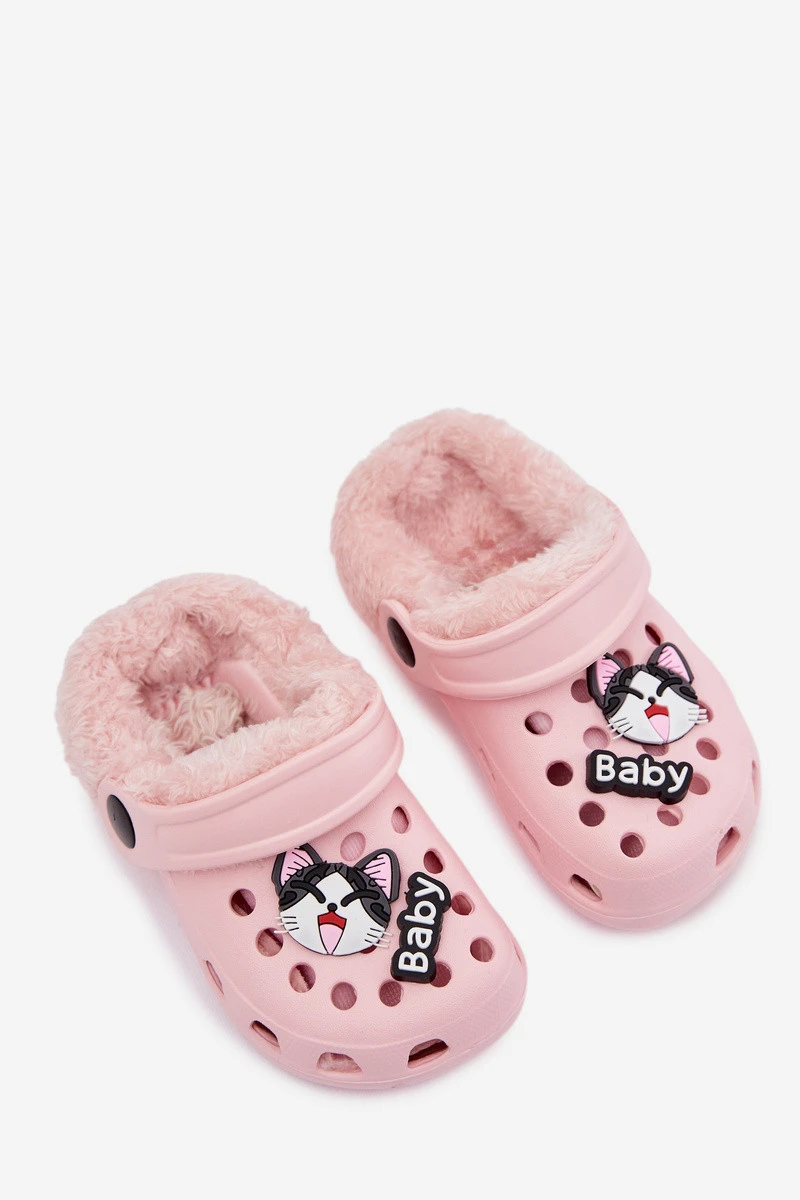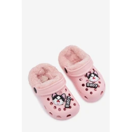 Dětské pěnové pantofle zateplené kožíškem s ozdobnými připínkami – růžové