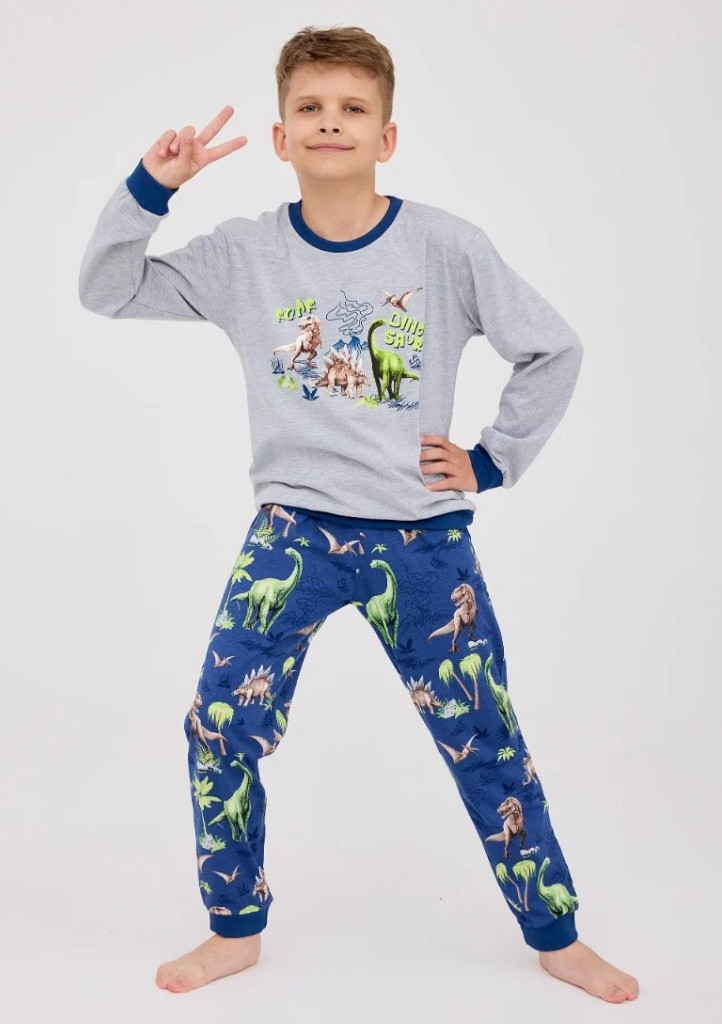 Pohodlné dětské pyžamo s dlouhými rukávy a nohavice zakončené pružnými manžetami, kalhoty mají širokou vkládanou gumu v pase. Tričko je světle, s dlouhým rukávem a potiskem dinosaurů. Kalhoty jsou vzorované, nejčastěji v modrém tónu.