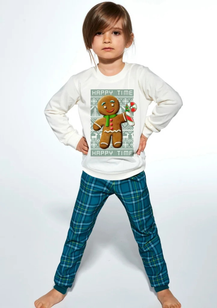 Dětské bavlněné pyžamo od značky Cornette. Pyžamo má tričko s dlouhým rukávem a na přední části obrázek. Spodní díl je dlouhý a po celé ploše vzorovaný. V pase je měkká, široká guma. Na rukávech i na nohavicích je pohodlný úplet.