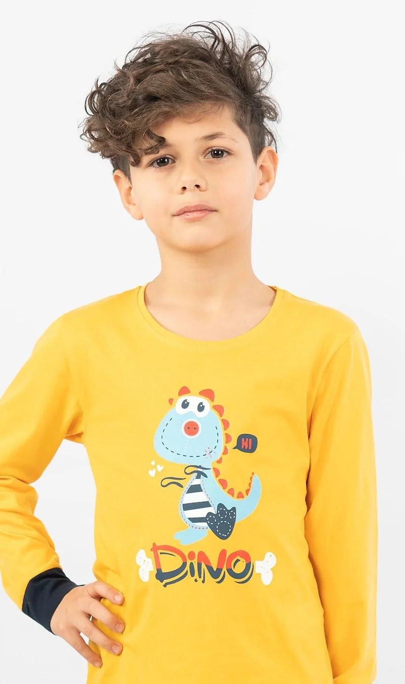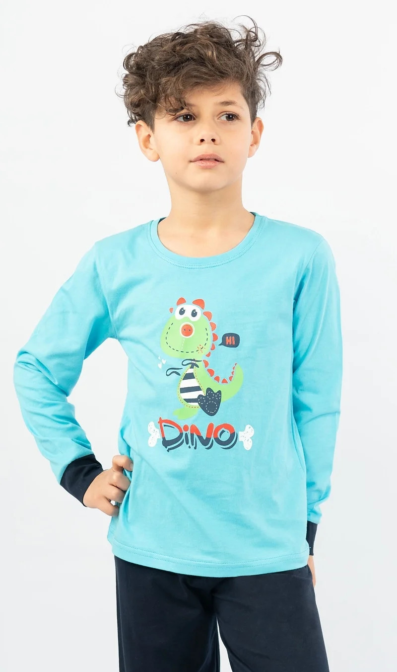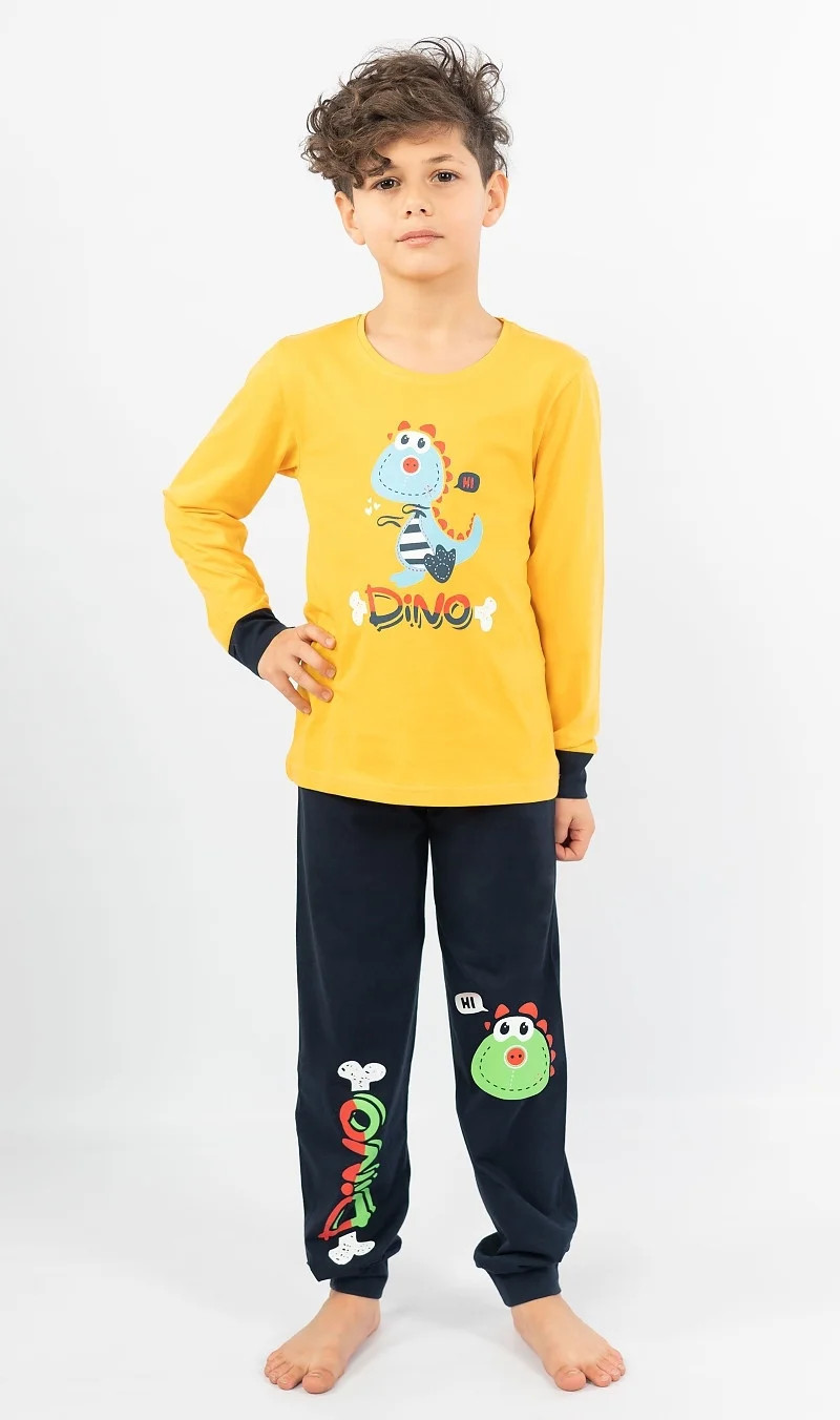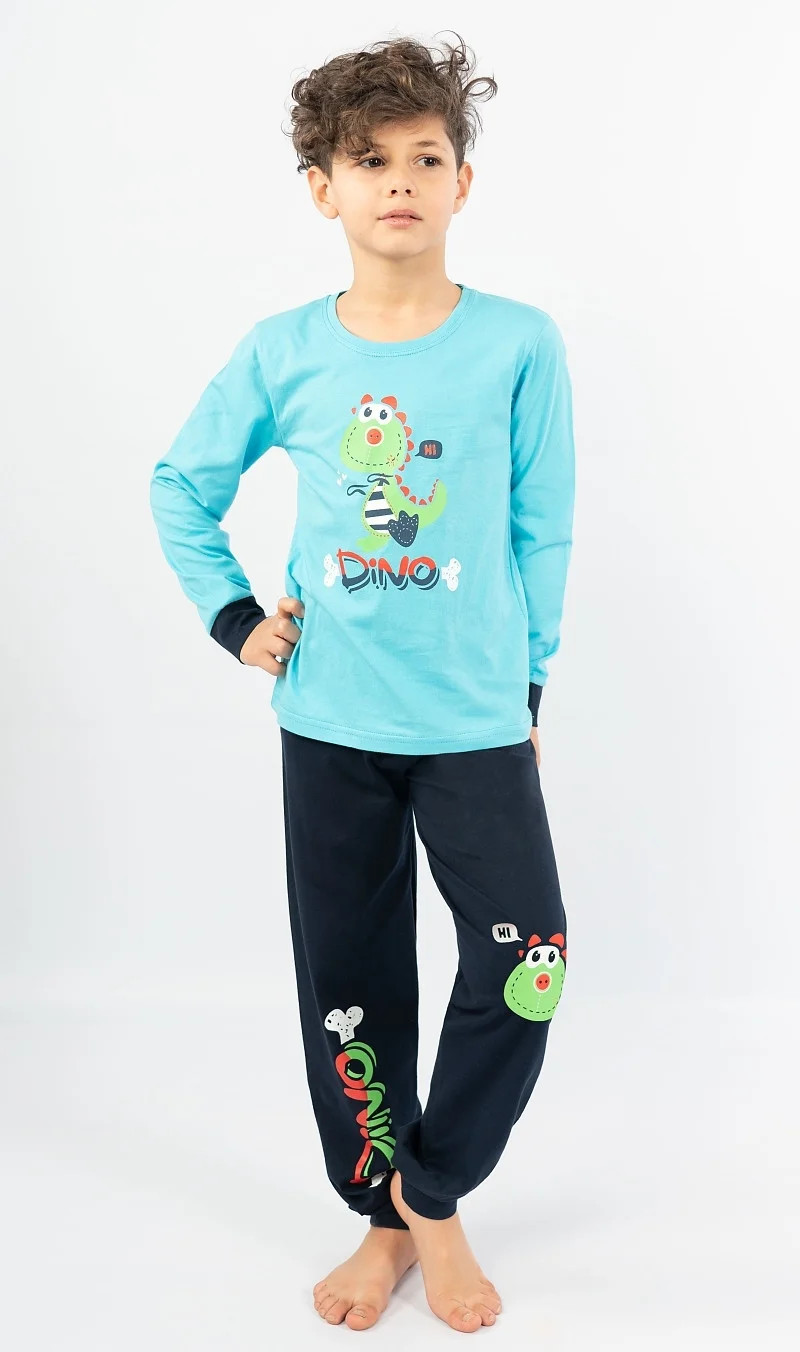 Dětské bavlněné pyžamo dlouhé Dino. Dětské pyžamo se skládá z trika s dlouhým rukávem a dlouhých kalhot. Na triku je obrázek dinosaura a nápis 'Dino'. Stejný motiv se opakuje i na dlouhých jednobarevných kalhotách, které jsou stejně jako tričko zakončeny panty. Kalhoty mají v pase gumu, nemají kapsy. Použitý bavlněný materiál je příjemný a poddajný na dotek.