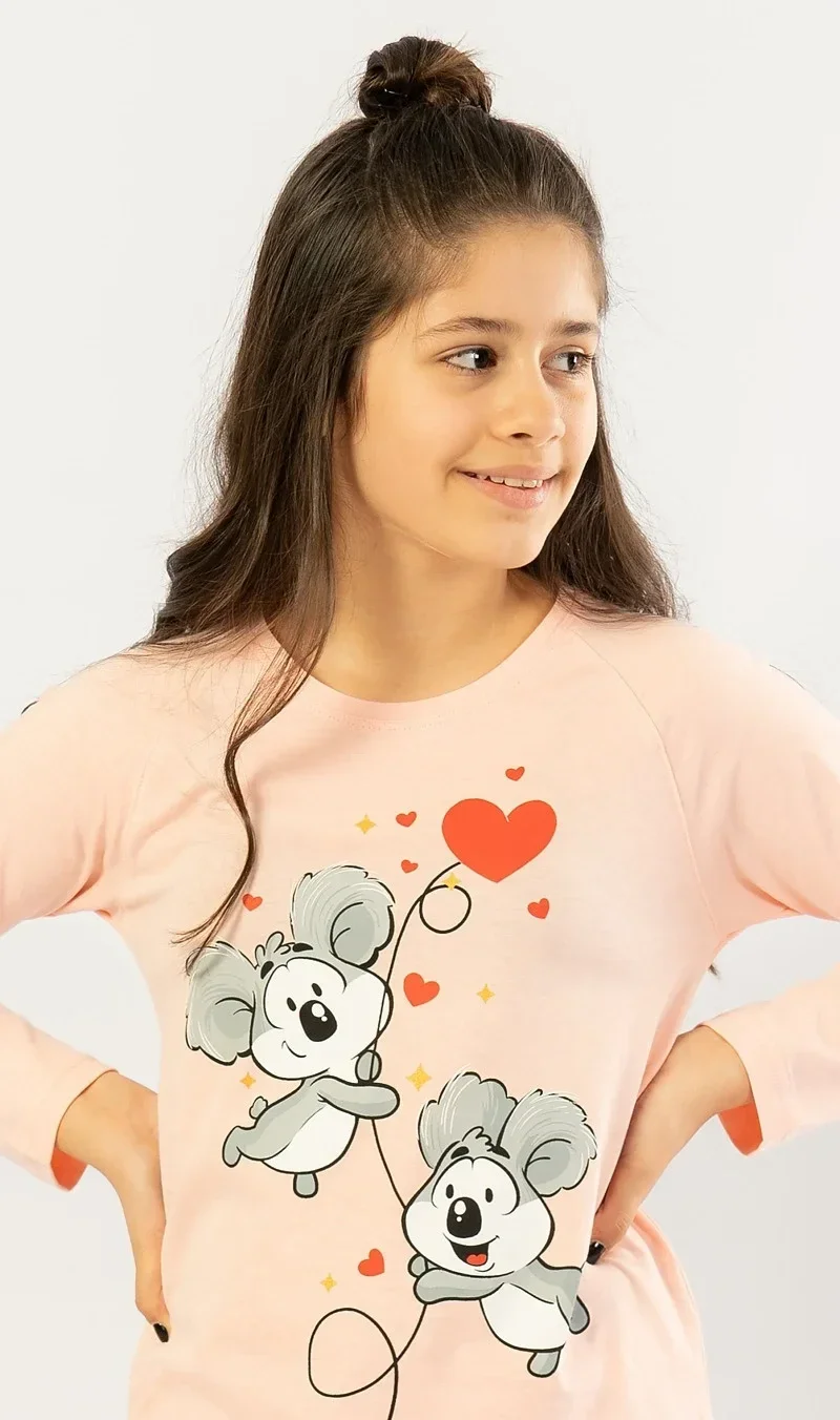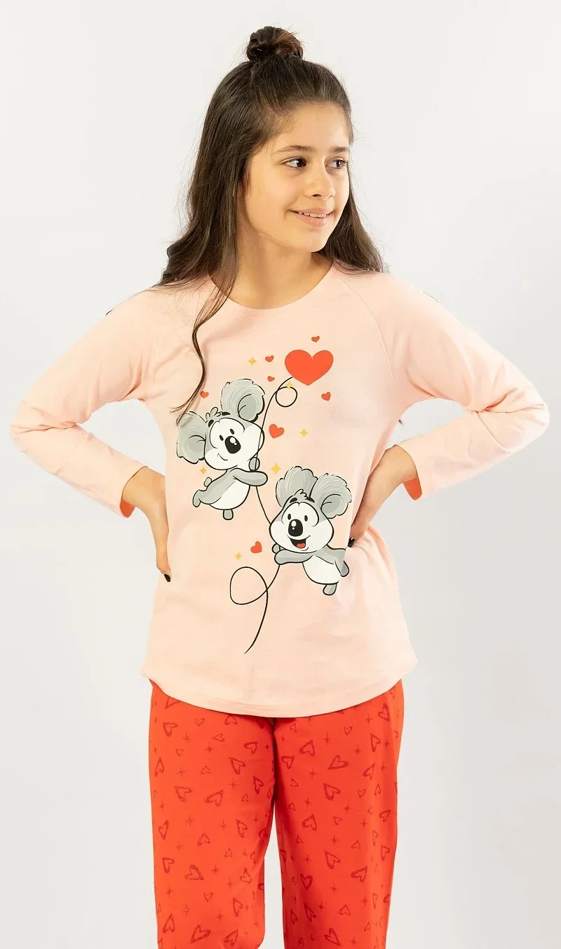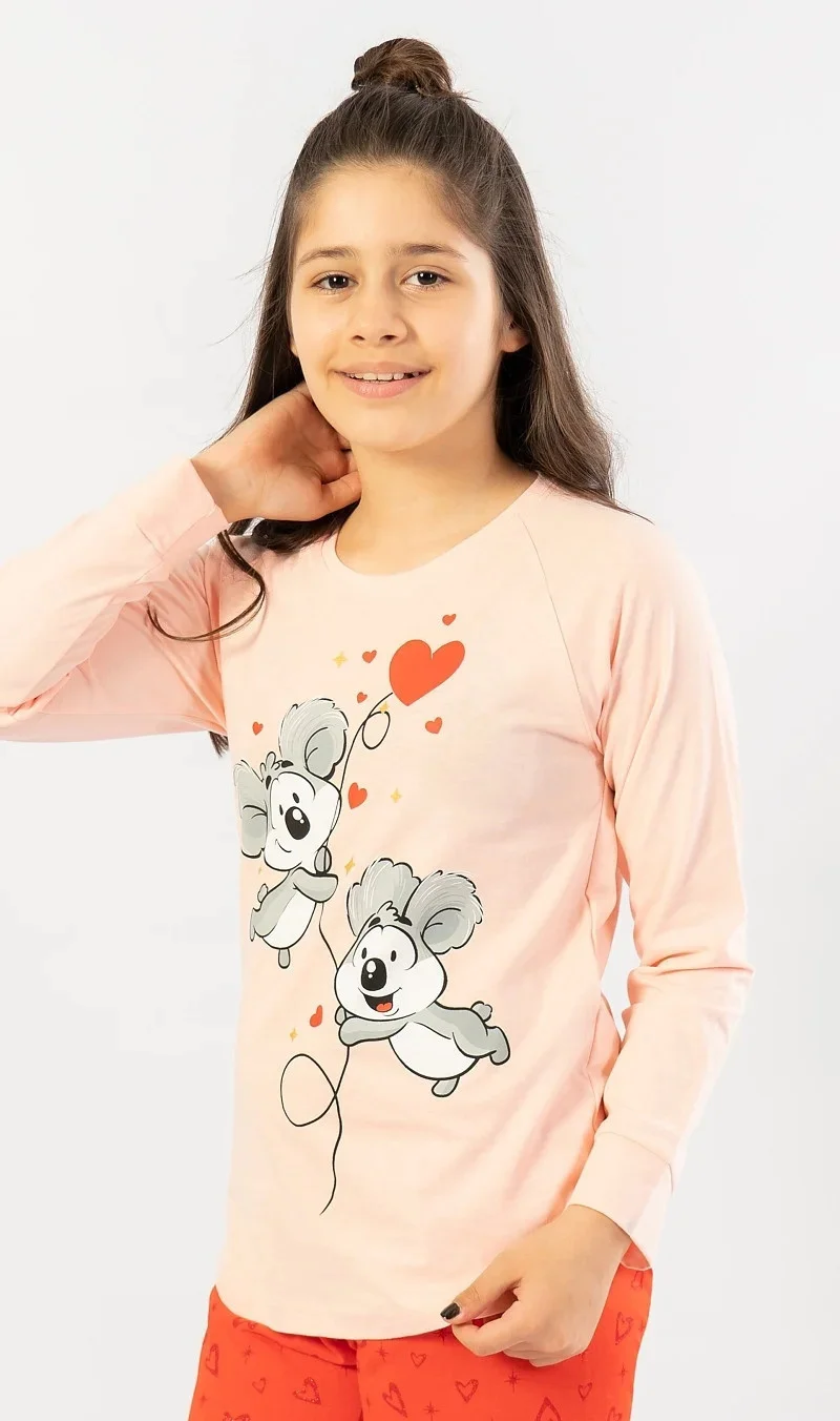 Dětské bavlněné pyžamo dlouhé Koaly. Dětské pyžamo se skládá z trika s dlouhým rukávem a dlouhých kalhot. Na triku je velký obrázek dvou roztomilých koal, které letí na balónku. Koaly obklopují srdíčka a hvězdičky. Motiv srdíček a hvězdiček se opakuje i na dlouhých kalhotách, které jsou zkončeny panty. Kalhoty mají v pase gumu a šňůrku na stažení, nemají kapsy. Použitý bavlněný materiál je příjemný a poddajný na dotek.