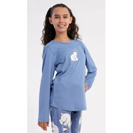 Dětské bavlněné dlouhé pyžamo Méďa a tučňák. Dívčí pyžamo se skládá z trika s dlouhým rukávem a dlouhých kalhot. Triko s kulatým výstřihem je ozdobeno obrázkem ledního medvěda. Tento motiv se opakuje i na kalhotách, které mají v pase gumu a šňůrku na stažení, nemají kapsy. Použitý bavlněný materiál je poddajný a příjemný na dotek.