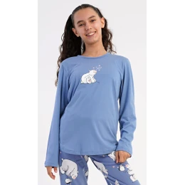 Dětské bavlněné dlouhé pyžamo Méďa a tučňák. Dívčí pyžamo se skládá z trika s dlouhým rukávem a dlouhých kalhot. Triko s kulatým výstřihem je ozdobeno obrázkem ledního medvěda. Tento motiv se opakuje i na kalhotách, které mají v pase gumu a šňůrku na stažení, nemají kapsy. Použitý bavlněný materiál je poddajný a příjemný na dotek.