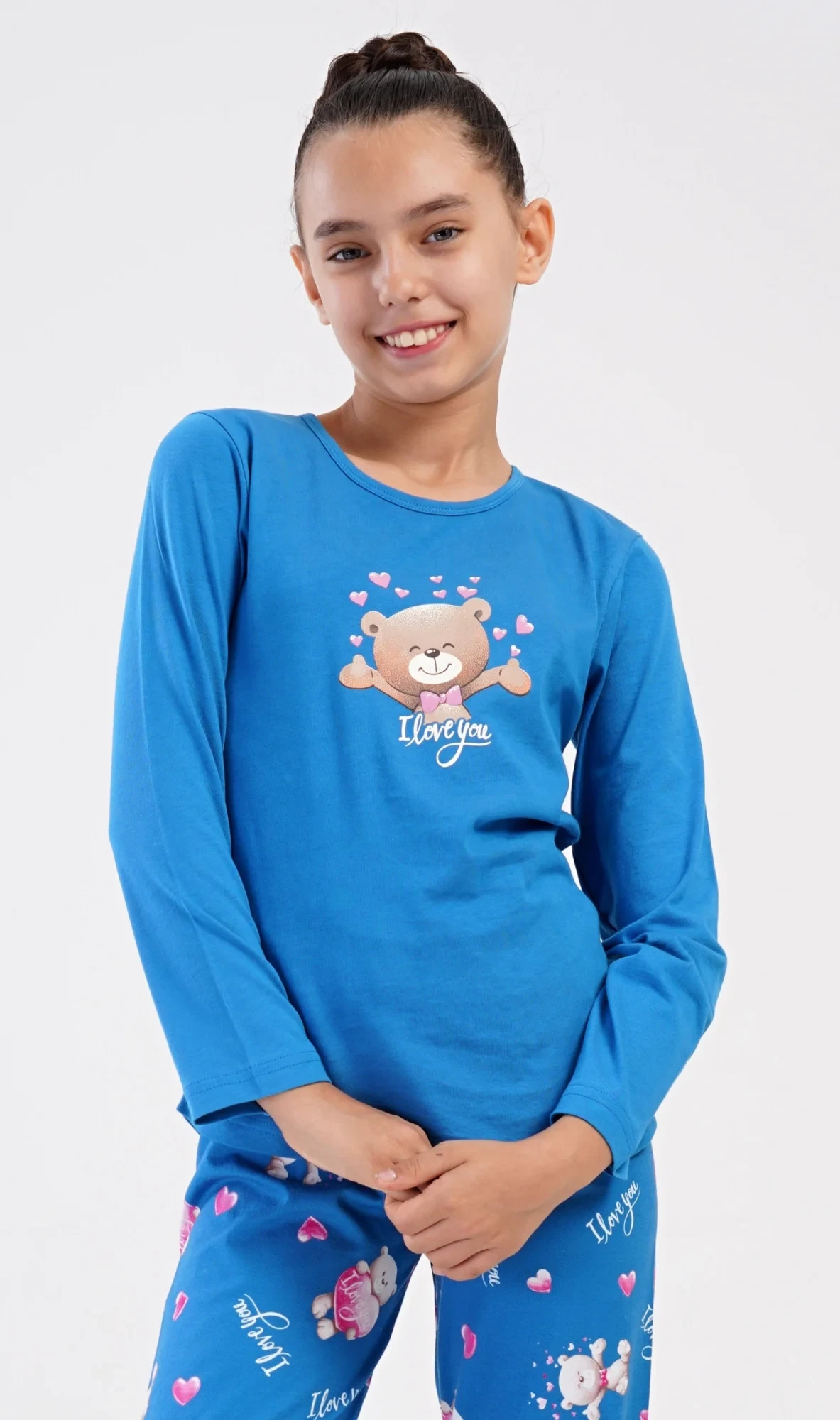 Dětské dlouhé bavlněné pyžamo Méďa I love you. Pyžamo se skládá z trika s dlouhým rukávem a dlouhých kalhot. Na triku s kulatým výstřihem je obrázek medvídka a nápis 'I love you'. Tento motiv se opakuje i na dlouhých kalhotách, které mají v pase gumu na stažení. Kalhoty nemají kapsy a jsou zakončeny lemy. Použitý bavlněný materiál je příjemný a poddajný na dotek .