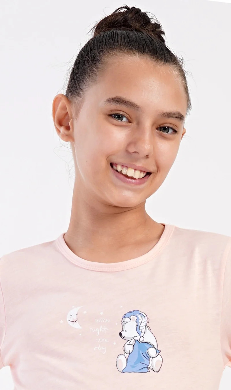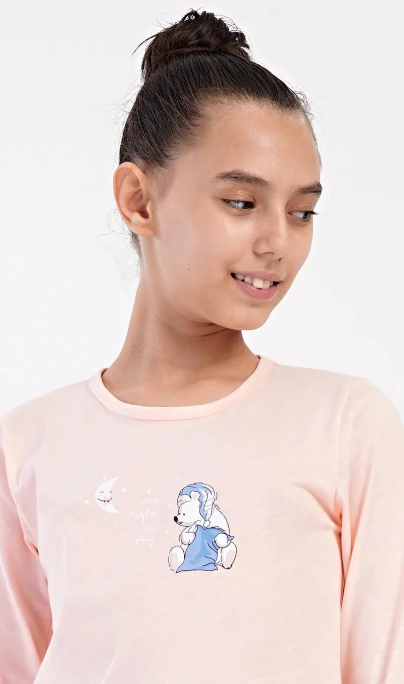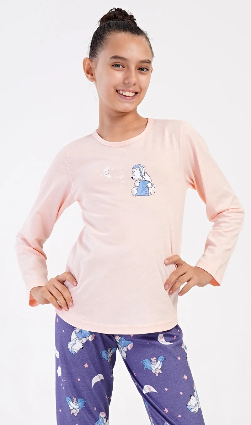 Dětské dlouhé bavlněné pyžamo Méďa s polštářem. Pyžamo se skládá z trika s dlouhým rukávem a dlouhých kalhot. Na triku s kulatým výstřihem je obrázek ledního medvídka s polštářem. Tento motiv se opakuje i na dlouhých kalhotách, které mají v pase gumu na stažení. Kalhoty nemají kapsy a jsou zakončeny lemy. Použitý bavlněný materiál je příjemný a poddajný na dotek .