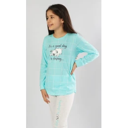 Dětské pyžamo dlouhé Sleeping day. Dětské pyžamo se skládá z trička s dlouhým rukávem a dlouhých nohavic. Na tričku s kostkovaným podkladem je spinkající pejsek, kolem kterého je nápis It´s a good day to sleeping. Stejný motiv se opakuje i na nohavici jednobarevných kalhot, které jsou zakončeny pantem. Použitý materiál je jemný a poddajný na dotek. Pyžamo je vhodné i na denní nošení.