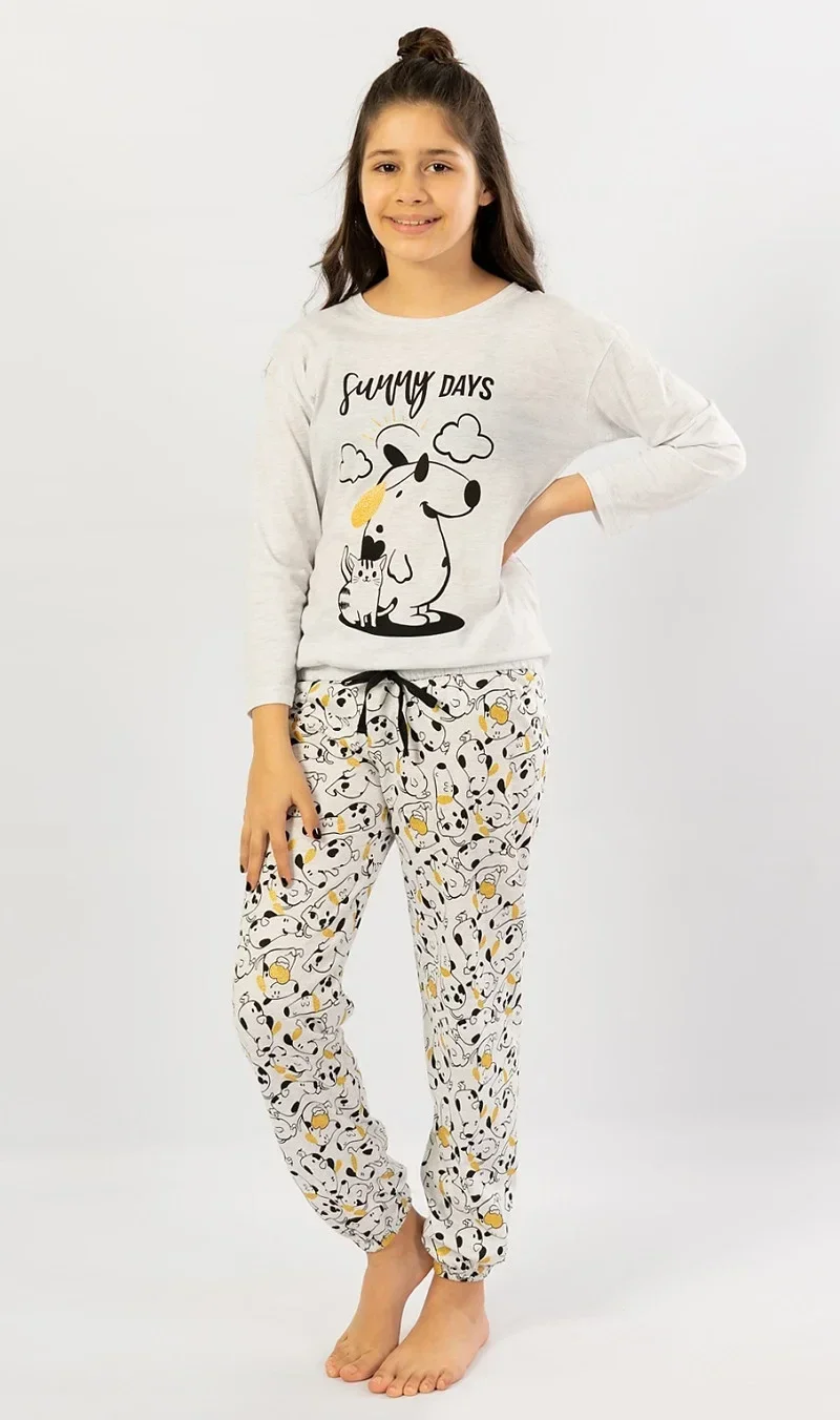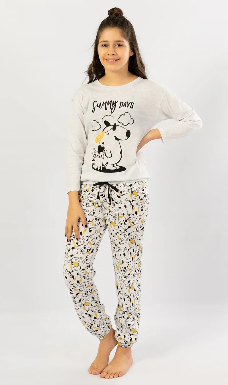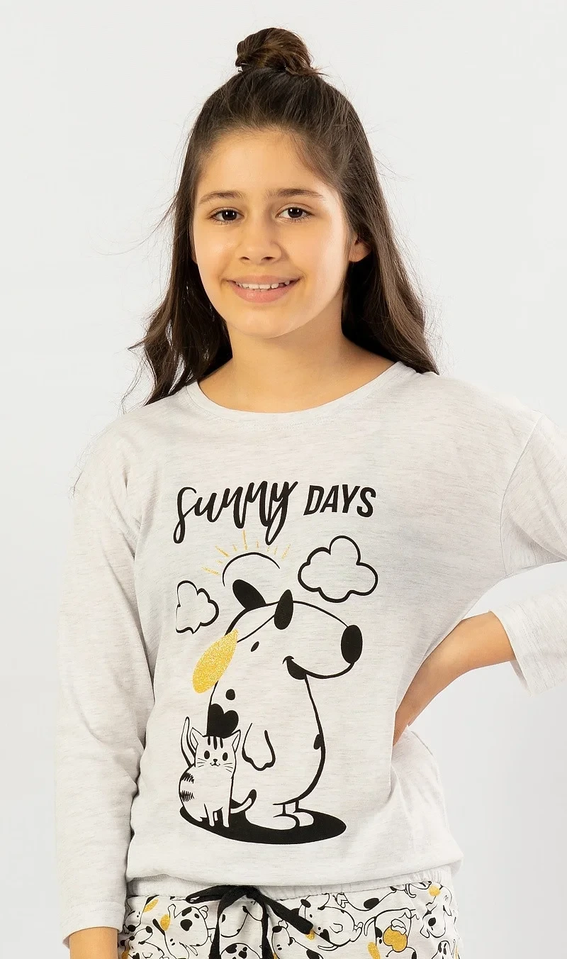 Dětské pyžamo dlouhé Sunny days. Dětské pyžamo se skládá z trika s dlouhým rukávem a dlouhých kalhot. Na triku mikinového typu je velký obrázek pejska a kočičky s nápisem 'Sunny days'. Tričko má ve spodní části gumku se šňůrkou na stažení. Motiv pejska a kočičky se opakuje i na dlouhých kalhotách, které jsou zakončeny lemem. Kalhoty mají v pase gumu a šňůrku na stažení, nemají kapsy. Použitý materiál s podílem bavlny 70% je příjemný a poddajný na dotek.