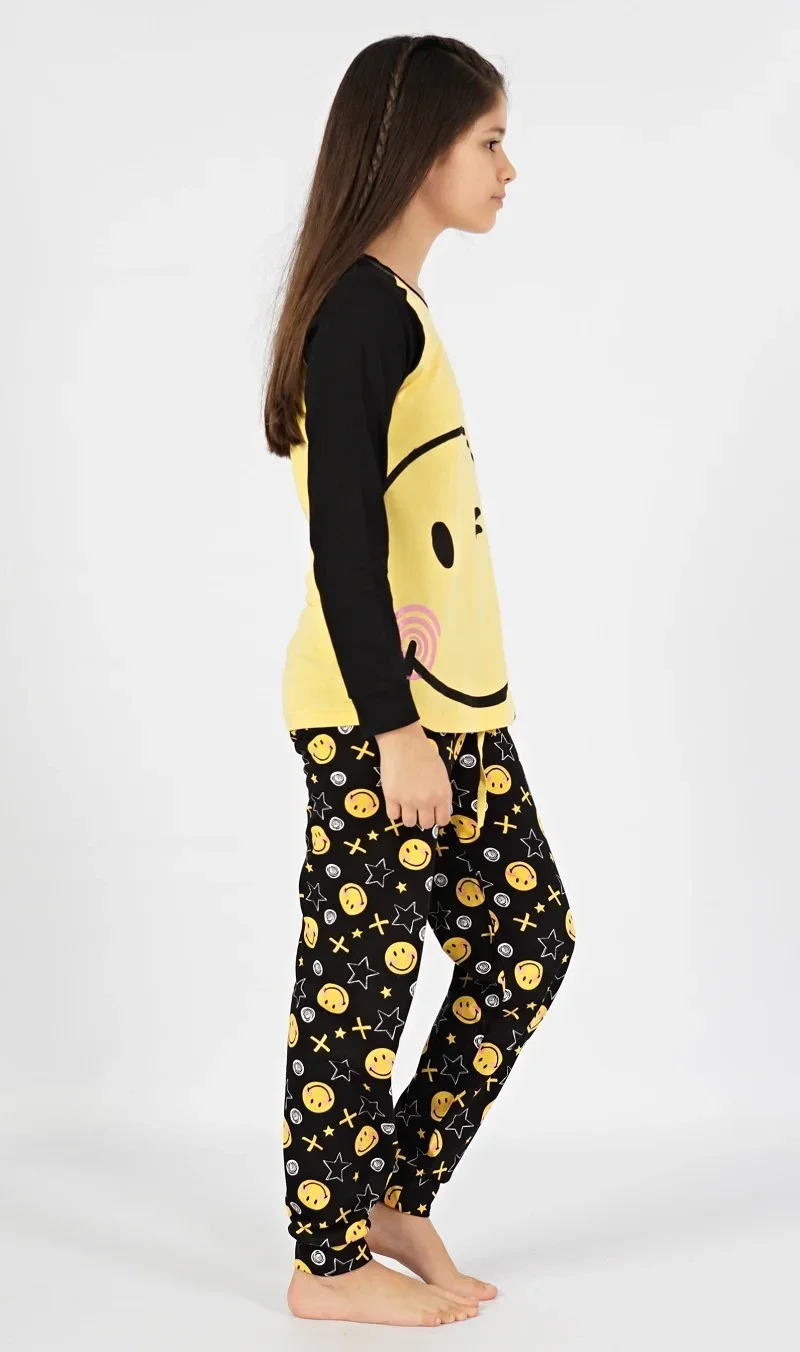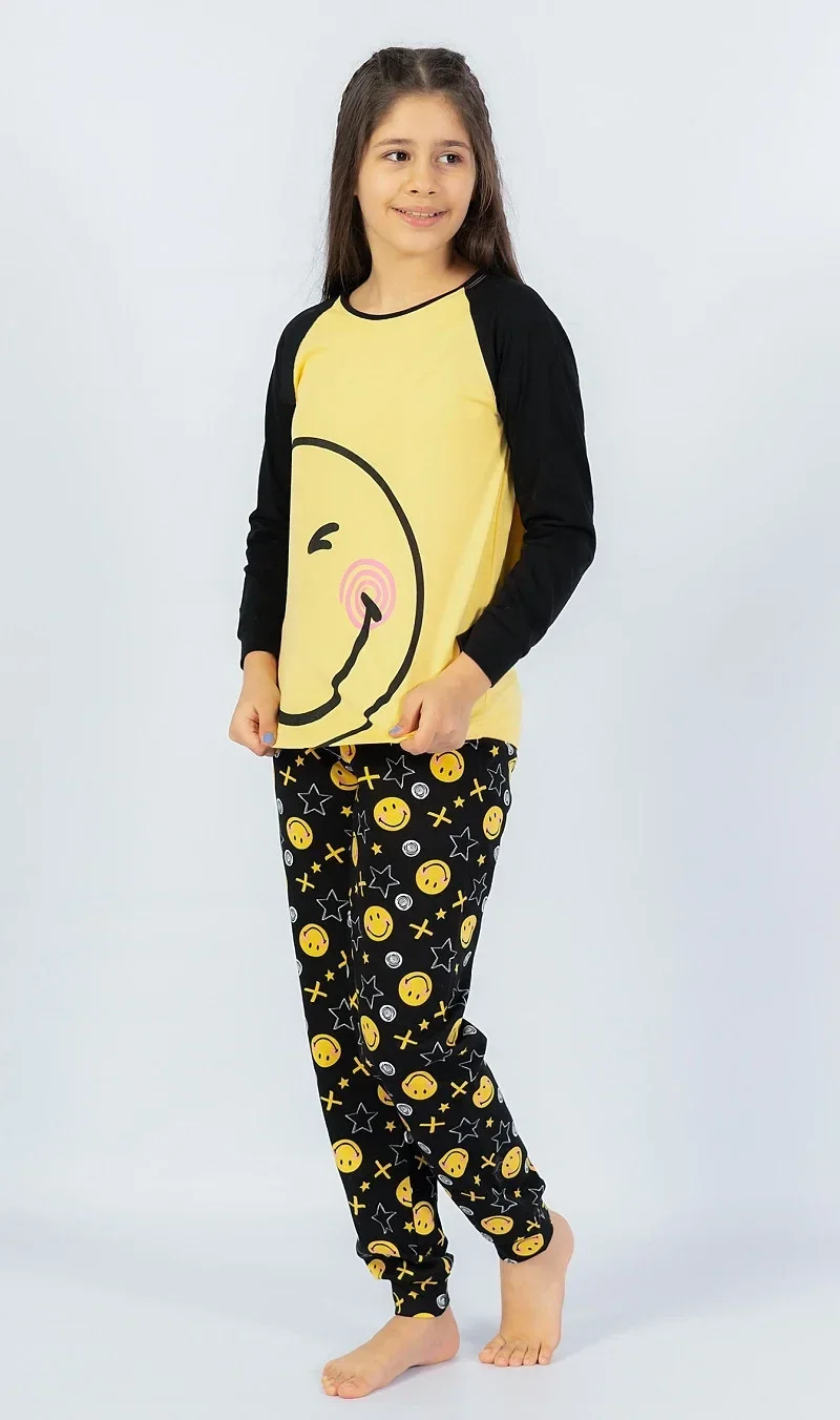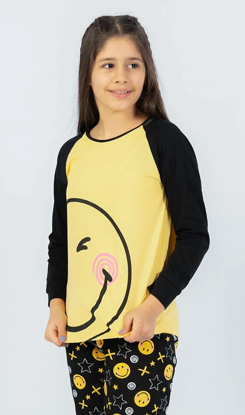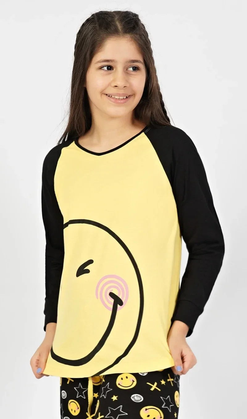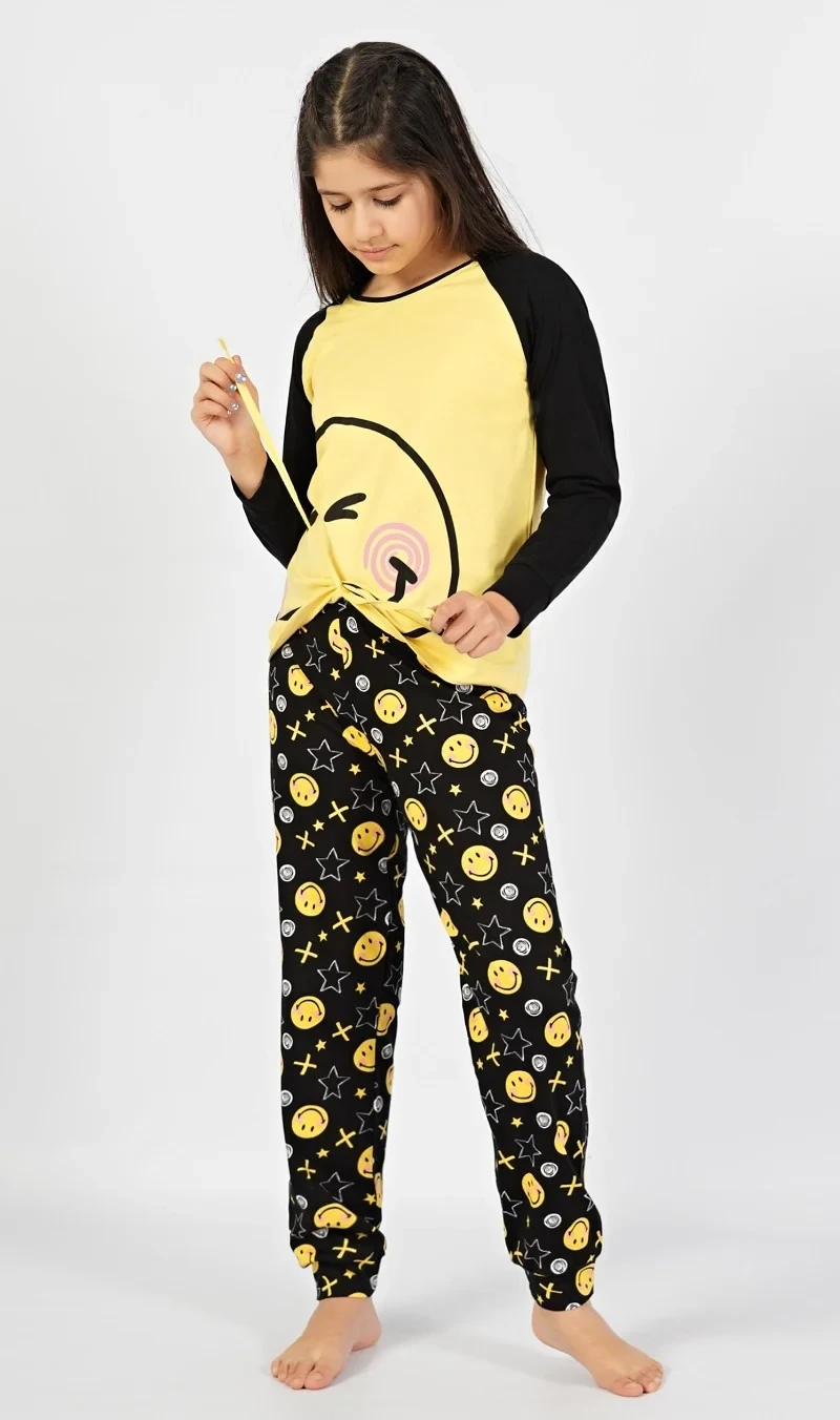 Dětské pyžamo dlouhé Úsměv. Pyžamo se skládá z trika s dlouhým rukávem a dlouhých kalhot. Na triku, které má barevně odlišené rukávy, je z boku natištěn velký rozesmátý smajlík. Motiv smajlíků s hvězdičkami a křížky se opakuje i na dlouhých kalhotách, které jsou zakončeny panty. Kalhoty mají v pase gumu a šňůrku na stažení, nemají kapsy. Použitý bavlněný materiál je příjemný a poddajný na dotek.