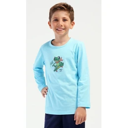 Dětské dlouhé bavlněné pyžamo Žabák. Pyžamo se skládá z trika s dlouhým rukávem a dlouhých kalhot. Na triku s kulatým výstřihem je obrázek veselého žabáka. Jednobarevné dlouhé kalhoty mají v pase gumu na stažení. Použitý bavlněný materiál je příjemný a poddajný na dotek.