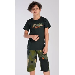 Dětské bavlněné pyžamo kapri Army. Dětské pyžamo se skládá z trička s krátkým rukávem a tříčtvrtečních kalhot. Na jednobarevném tričku s kulatým výstřihem je nápis '417 one route'. Maskáčové kapri kalhoty mají v pase gumu, nemají kapsy. Použitý bavlněný materiál je příjemný a poddajný na dotek.