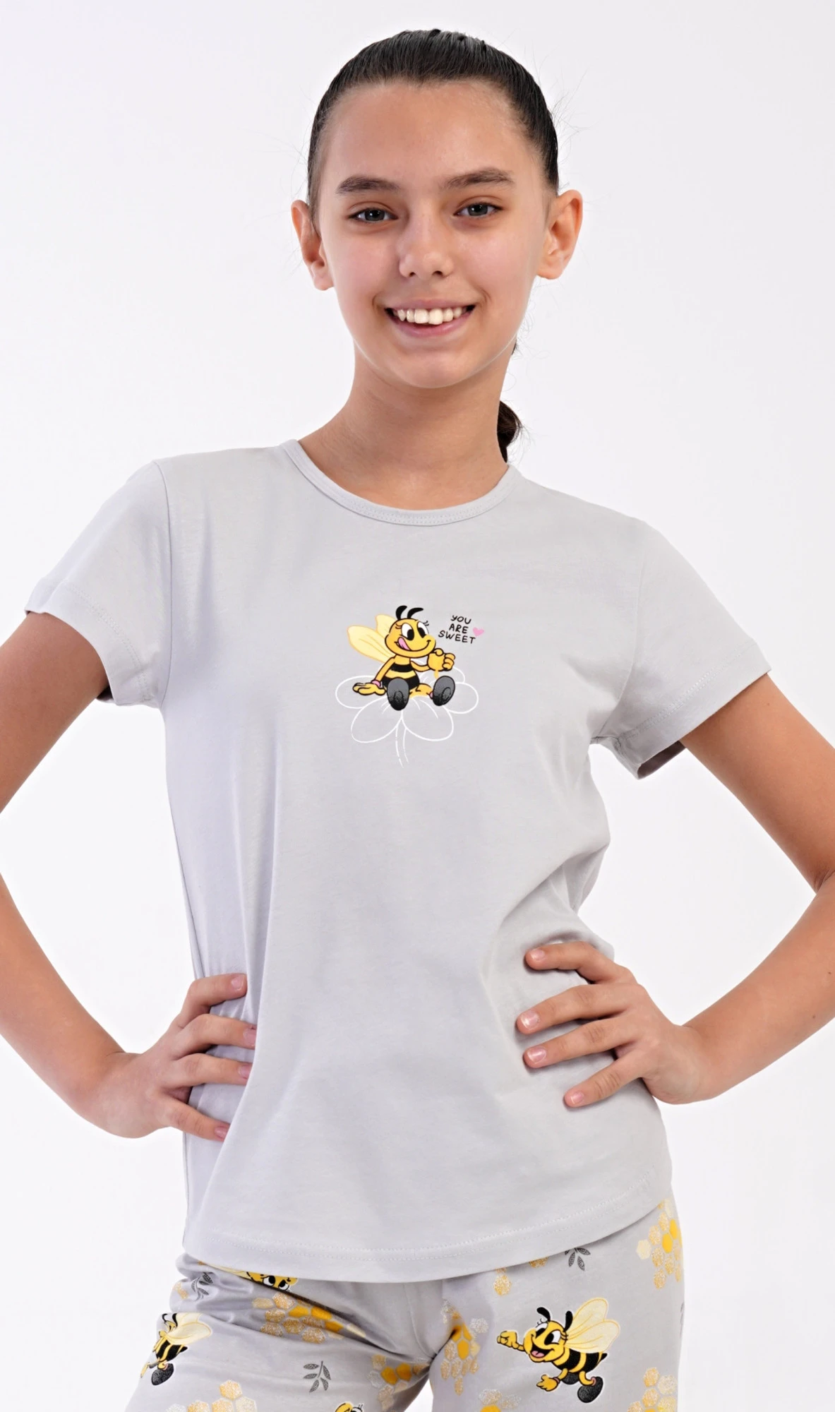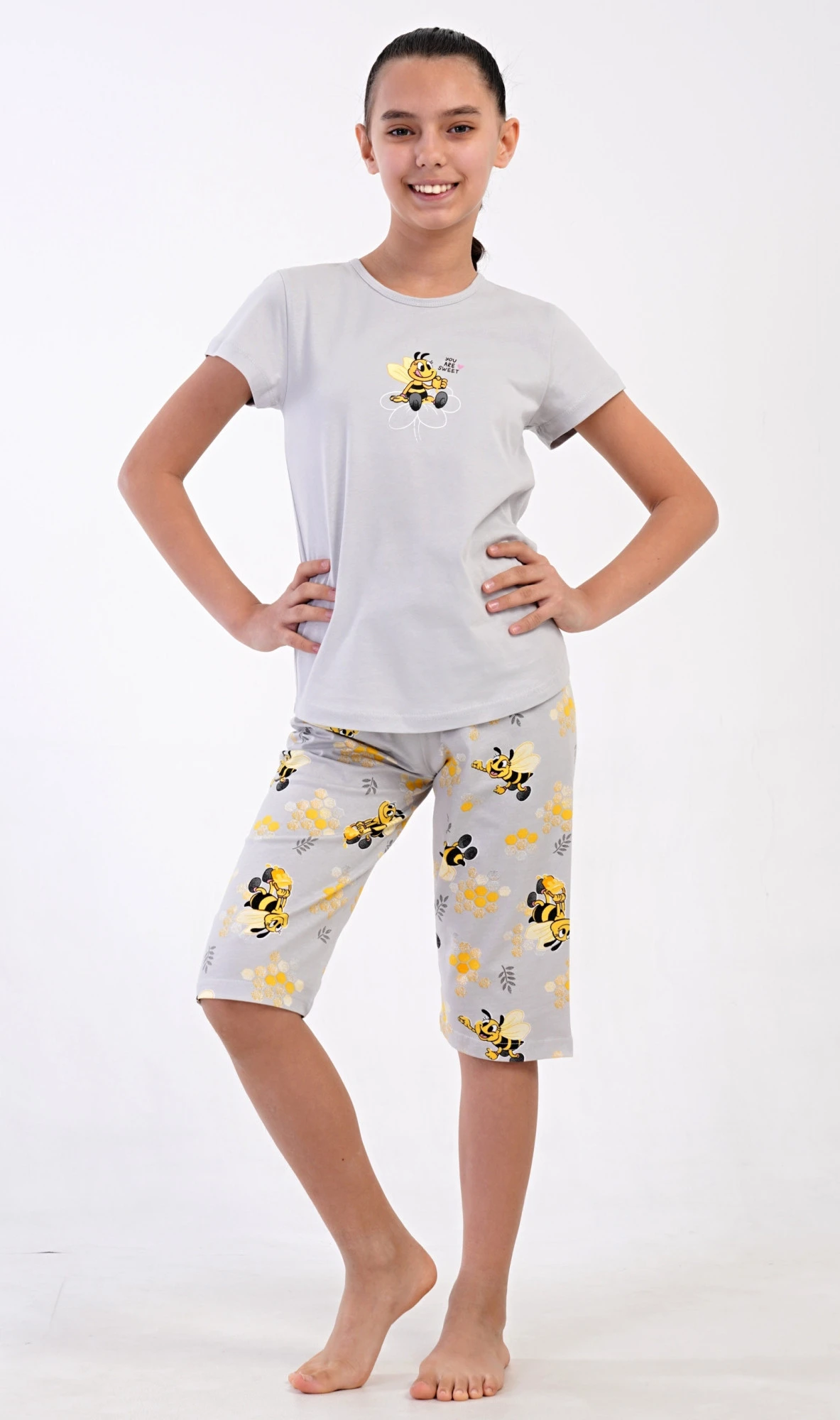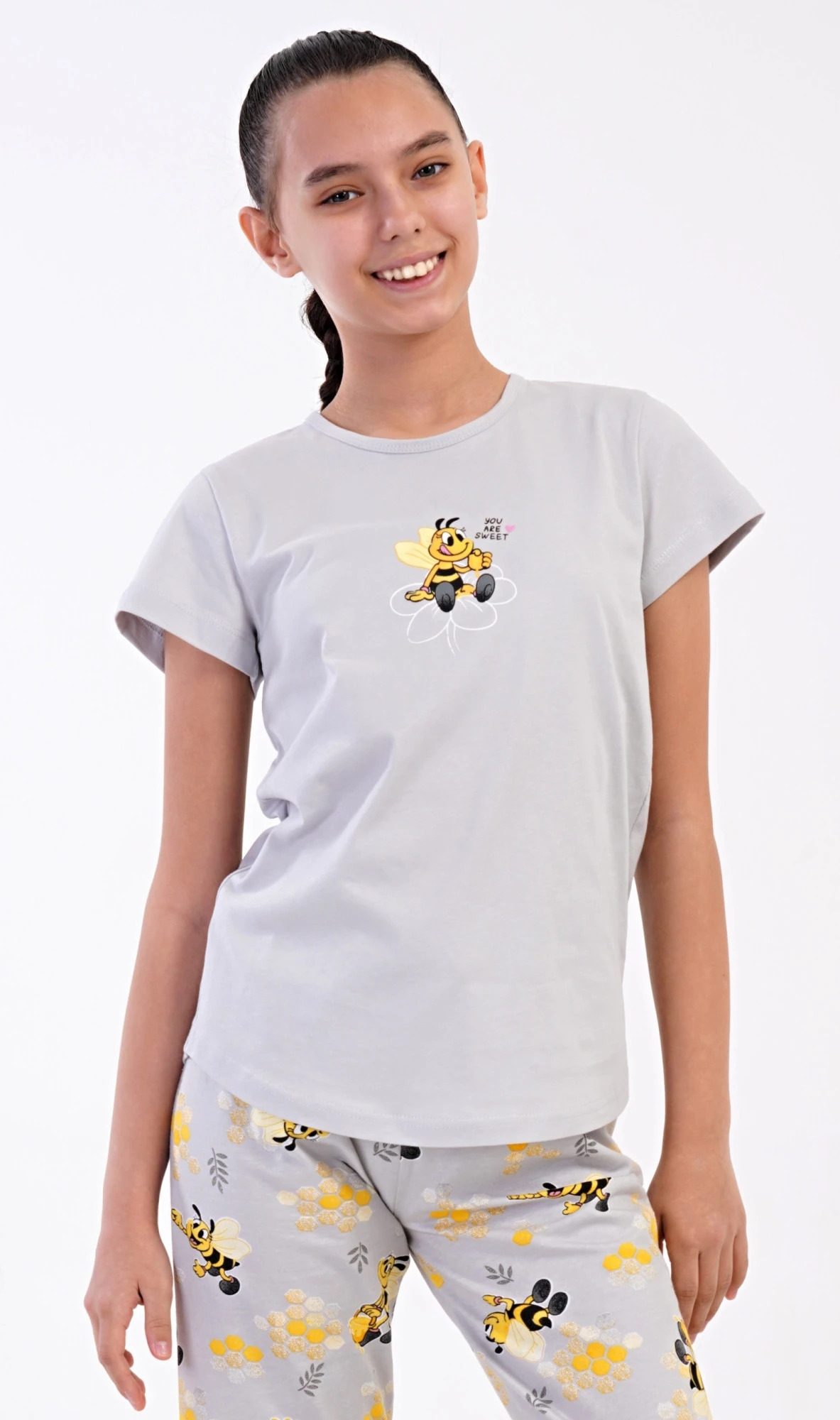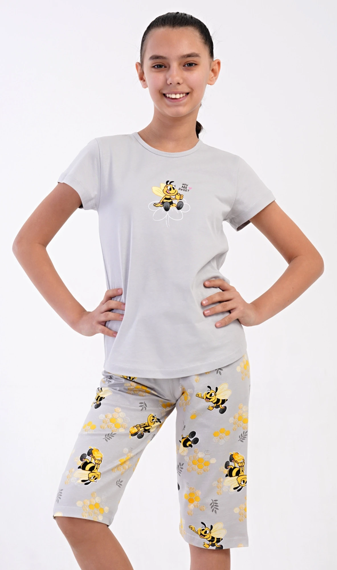 Dětské bavlněné kapri pyžamo Včelky. Dětské pyžamo se skládá z trička s krátkým rukávem a tříčtvrtečních kalhot. Na jednobarevném tričku je obrázek včelky. Tento motiv se opakuje i na kalhotách. Použitý bavlněný materiál je příjemný a poddajný na dotek.