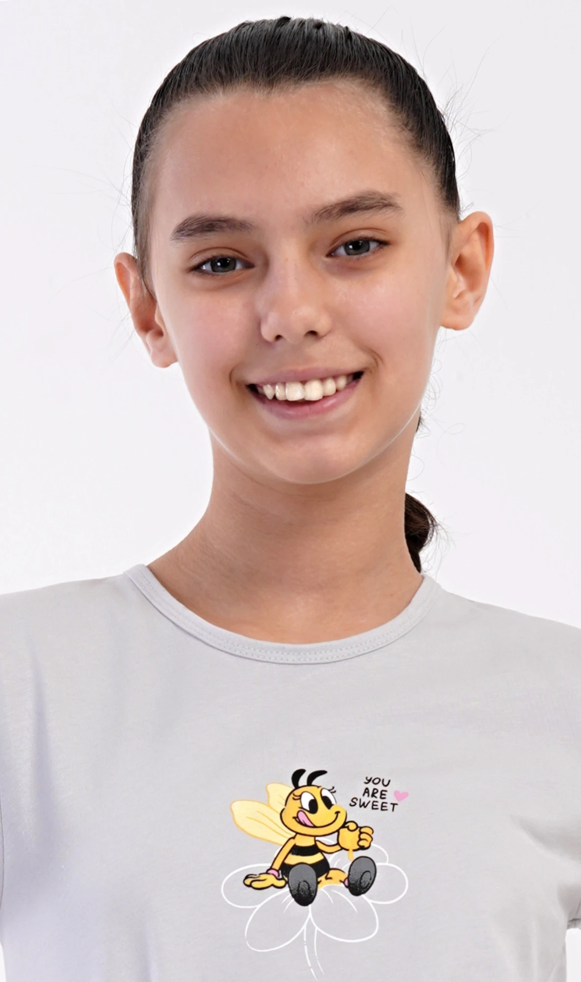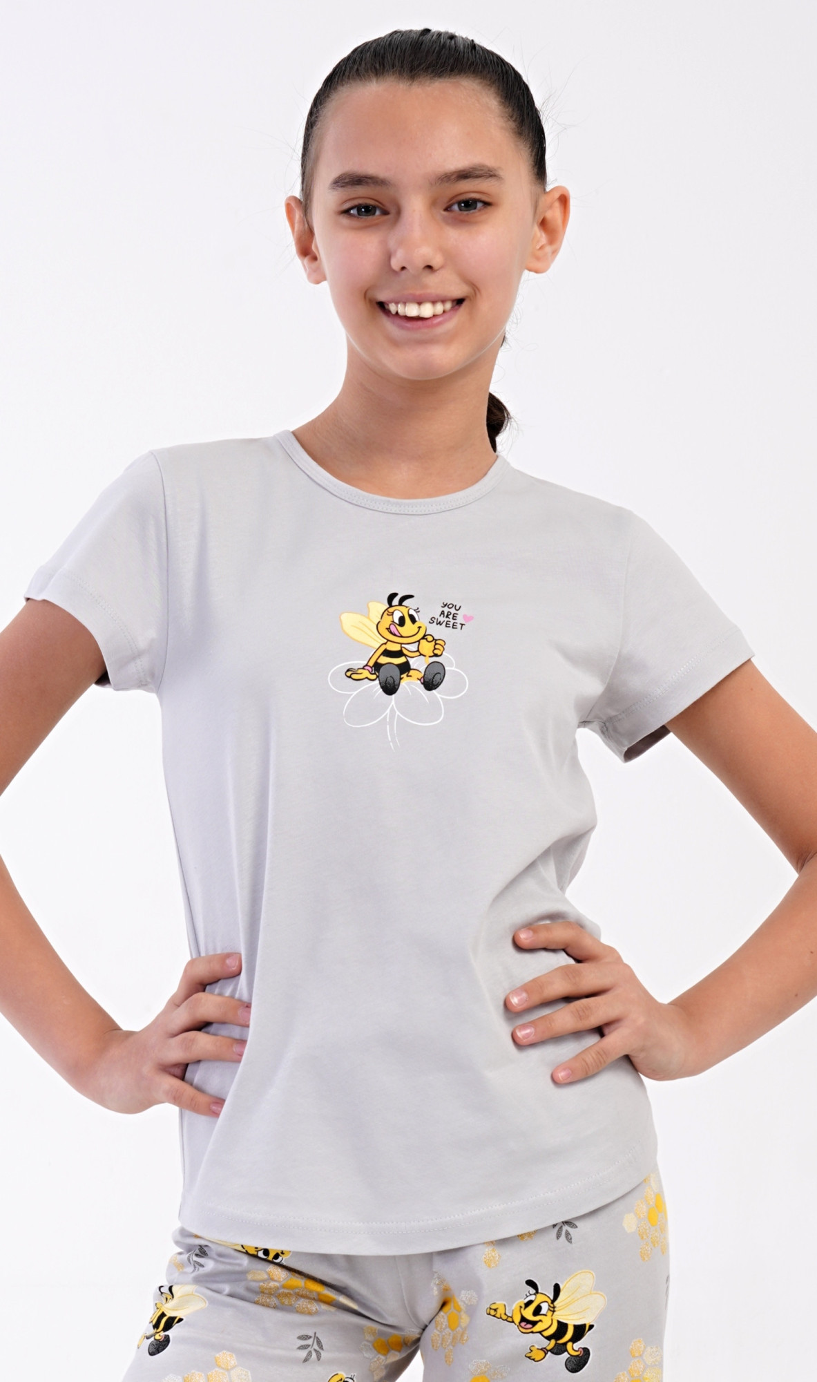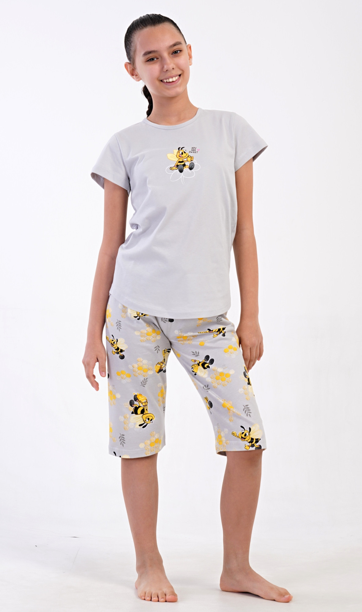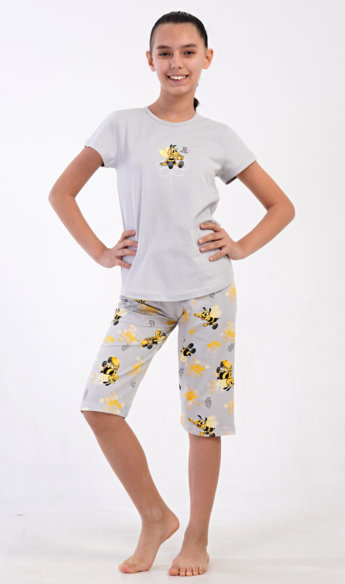 Dětské bavlněné kapri pyžamo Včelky. Dětské pyžamo se skládá z trička s krátkým rukávem a tříčtvrtečních kalhot. Na jednobarevném tričku je obrázek včelky. Tento motiv se opakuje i na kalhotách. Použitý bavlněný materiál je příjemný a poddajný na dotek.