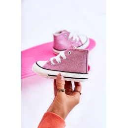 Vysoké dětské tenisky z textilního materiálu. Zdobené třpytkami. Klasická vazba. Špička vyztužená pryžovým materiálem. Měkká a textilní stélka. Gumová podrážka a protiskluzová. Lehké a pohodlné tenisky. Ideální na jarní a letní sezónu. Při výběru velikosti použijte tabulku velikostí.
