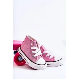 Vysoké dětské tenisky z textilního materiálu. Zdobené třpytkami. Klasická vazba. Špička vyztužená pryžovým materiálem. Měkká a textilní stélka. Gumová podrážka a protiskluzová. Lehké a pohodlné tenisky. Ideální na jarní a letní sezónu. Při výběru velikosti použijte tabulku velikostí.