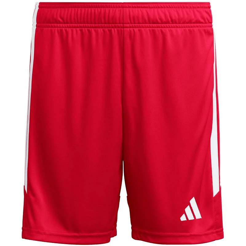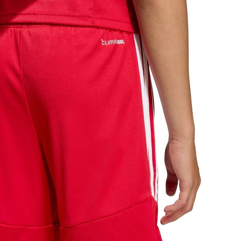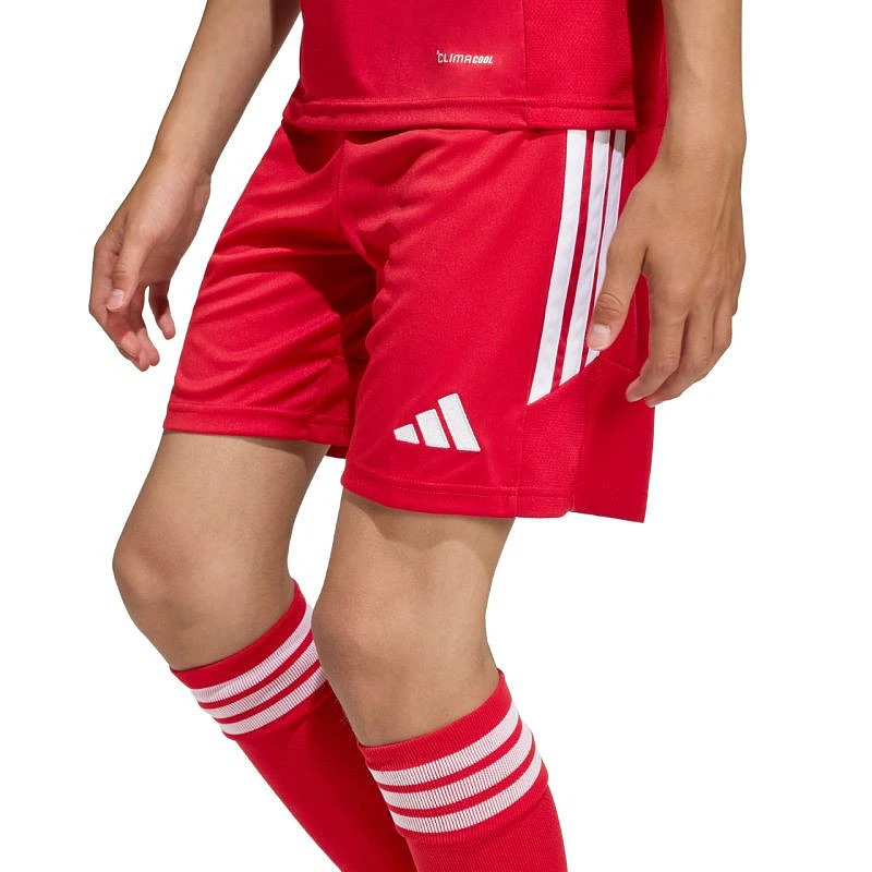 Adidas Tiro 26 League Red KA8817 Dětské šortky z řady adidas Tiro pro rozhodující zápasy, s elastickým pasem nastavitelným pomocí vnitřní stahovací šňůrky, technologií Climacool, bočními pruhy, malým vyšitým logem, tkaninou ze 100% recyklovaného polyesteru a stahovací šňůrkou v pase.
