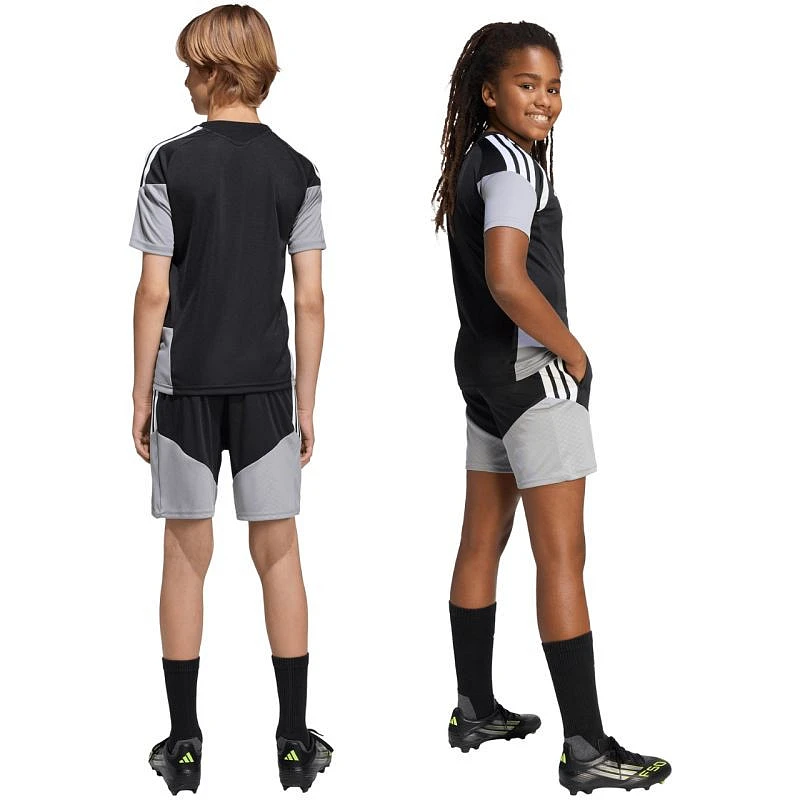 Spodenki dla dzieci adidas Tiro 26 Competition Training czarno-szare KA7655 Spodenki dla dzieci adidas sprawdzą się podczas treningów. Model pochodzi z linii Tiro. Elastyczna talia regulowana wewnętrznym sznurkiem. Technologia Climacool pochłania i odprowadza pot. Paski po bokach. Subtelne logo. Materiał: 100% poliester pochodzący z recyklingu