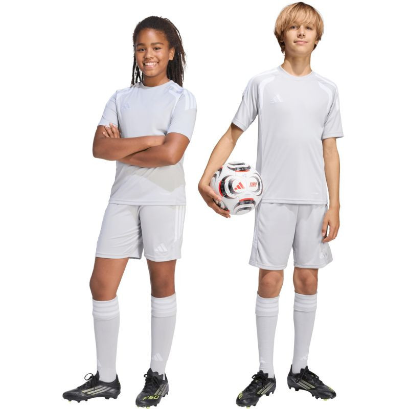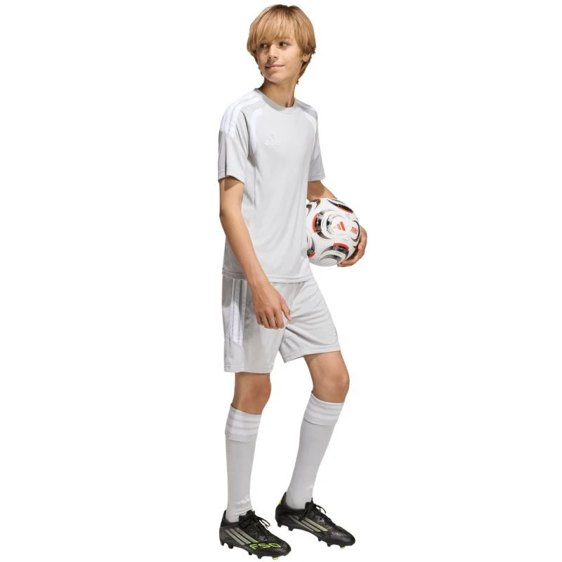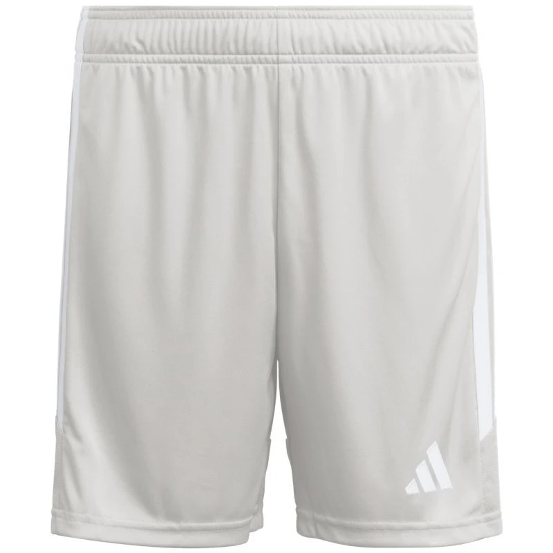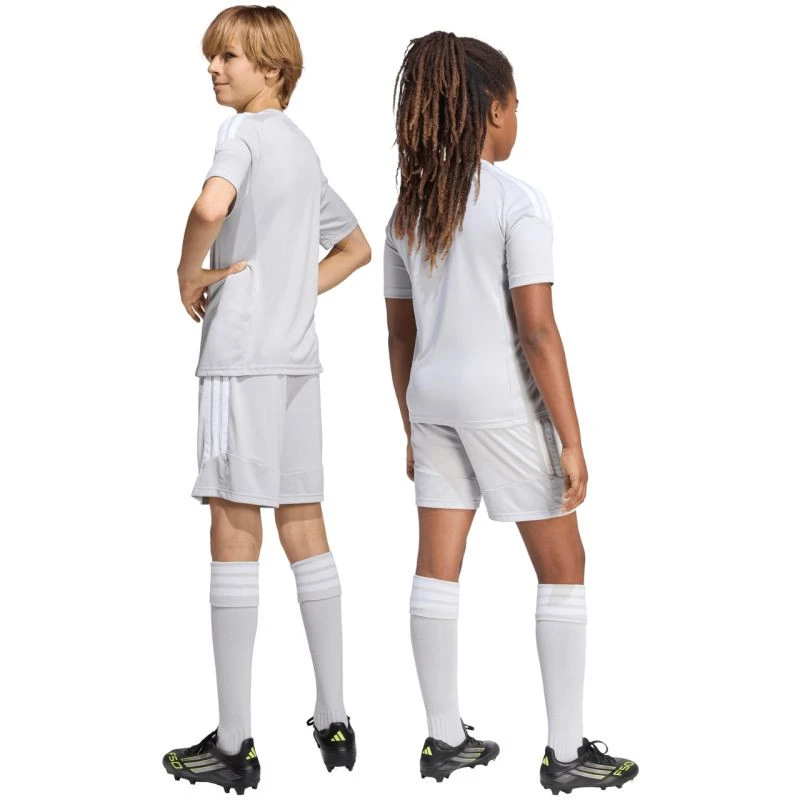 Šortky adidas Tiro 26 League šedé KA8815 Dětské šortky z řady adidas Tiro, ideální na rozhodující zápasy. Elastický pas s vnitřní stahovací šňůrkou. Technologie Climacool. Pruhy na bocích. Malé vyšívané logo. Materiál: 100% recyklovaný polyester.