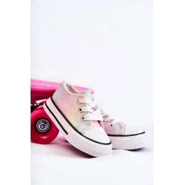 Dětské tenisky z textilního materiálu. Zdobené třpytkami. Klasická vazba. Špička vyztužená pryžovým materiálem. Měkká a textilní stélka. Gumová podrážka a protiskluzová. Lehké a pohodlné tenisky. Ideální na jarní a letní sezónu. Při výběru velikosti použijte tabulku velikostí.